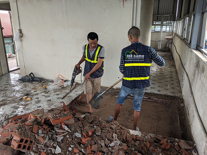 - Dựa trên bản thiết kế đã được phía khách hàng kiểm duyệt. Đội ngũ thi công của phía MB Home tiến hành phá dỡ, cải tạo xây dựng theo đúng thiết kế. Đảm bảo thời gian và tiến độ cam kết.