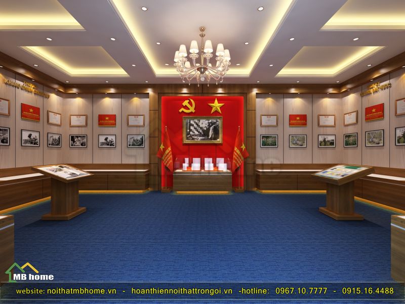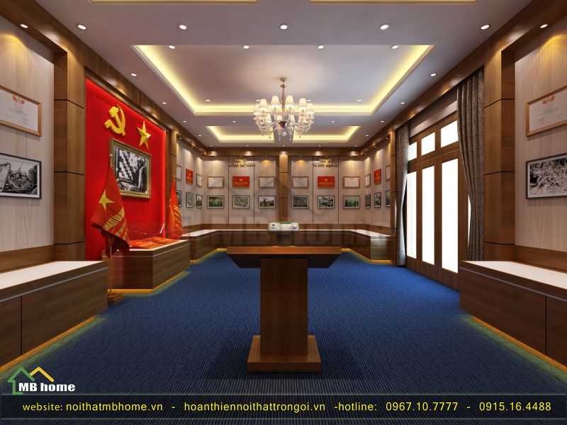 Thiết kế nội thất căn phòng trưng bày này, chúng tôi đã sử dụng màu đỏ tượng trương cho lòng nhiệt huyết của dân tộc cùng nền màu xanh nước vô cùng sang trọng và trang nghiêm. giúp cho căn phòng thêm sự bắt mắt và người nhìn cảm thấy thích thú hơn với các tư liệu năm xưa của anh Cường bày biện.