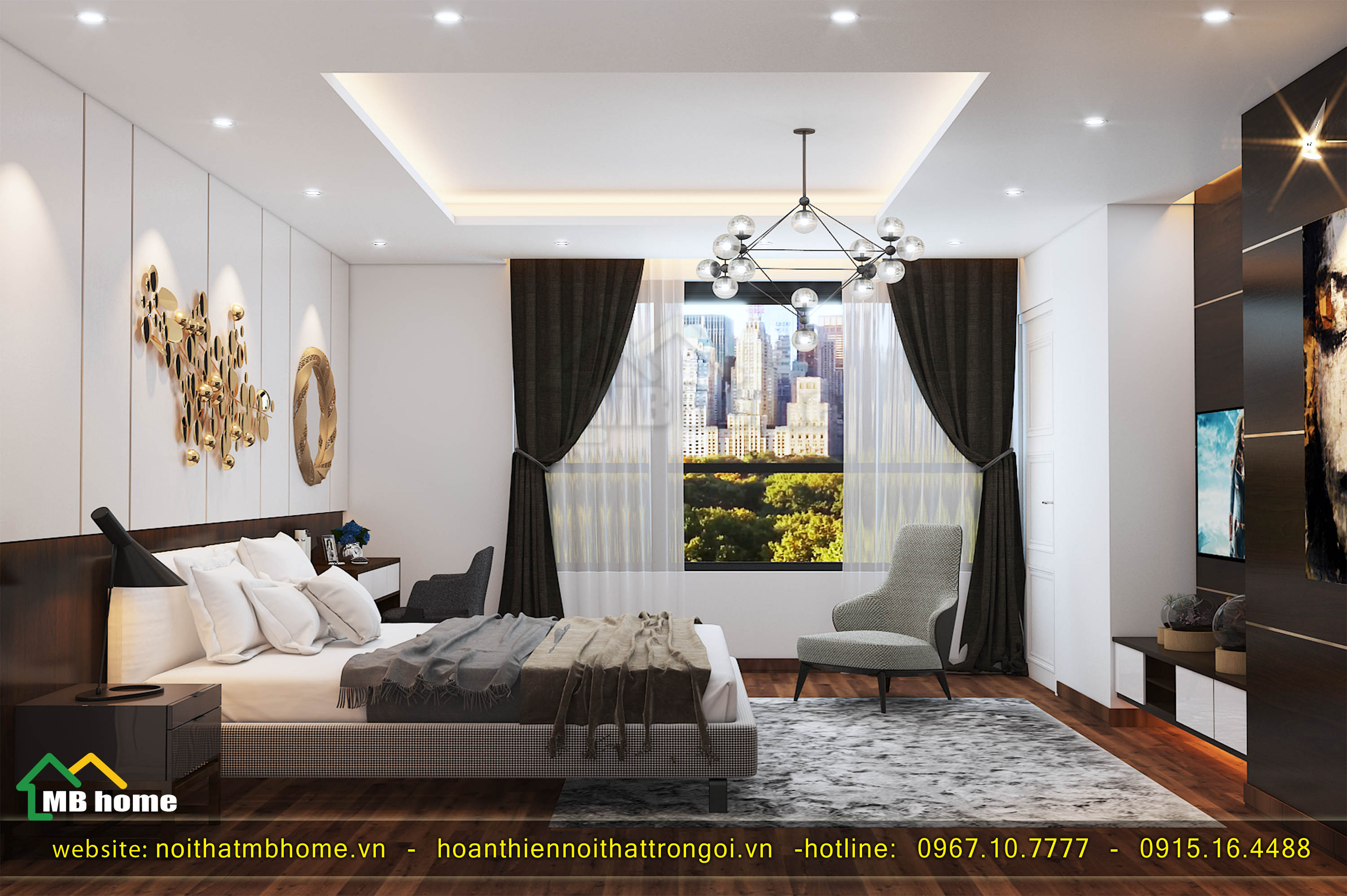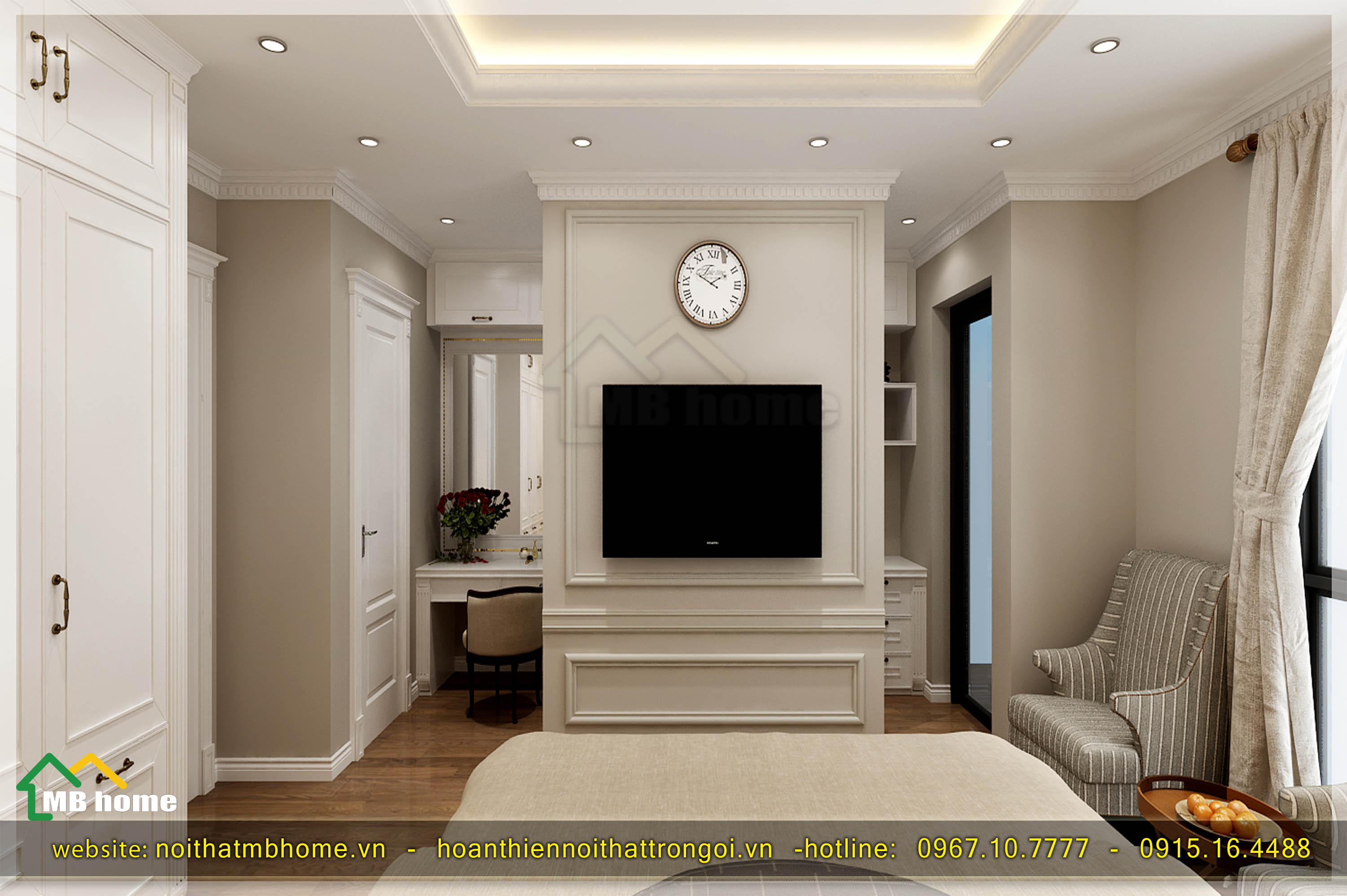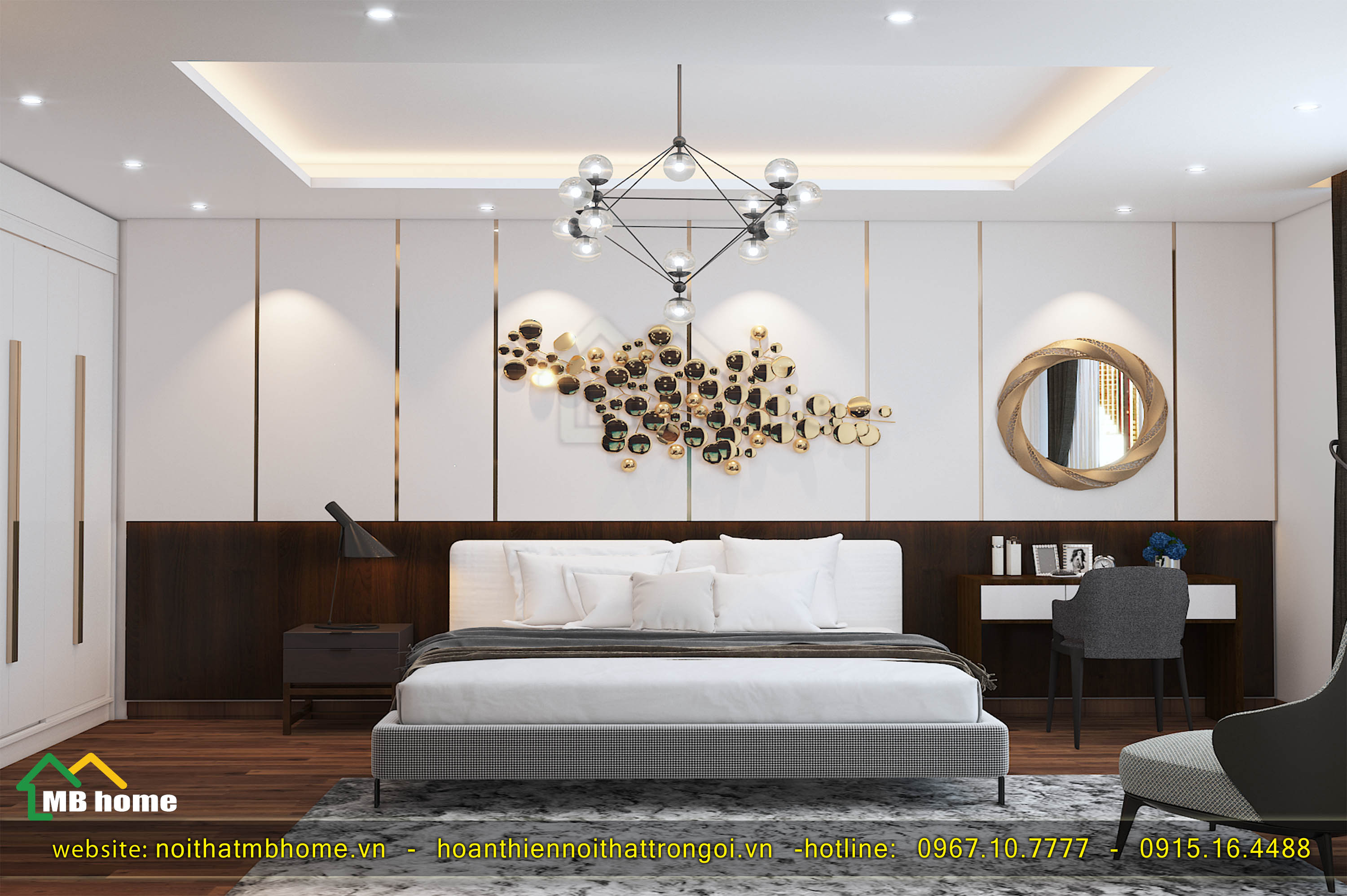 Phòng ngủ tại biệt thự Gamuda có diện tích không quá rộng rãi nên khi lựa chọn thiết kế nội thất phòng ngủ, MB Home đã sử dụng chất liệu tân cổ điển hiện đại với ít các chi tiết nhỏ trong nội thất, nhưng vẫn toát lên vẻ đẹp châu Âu sang trọng.