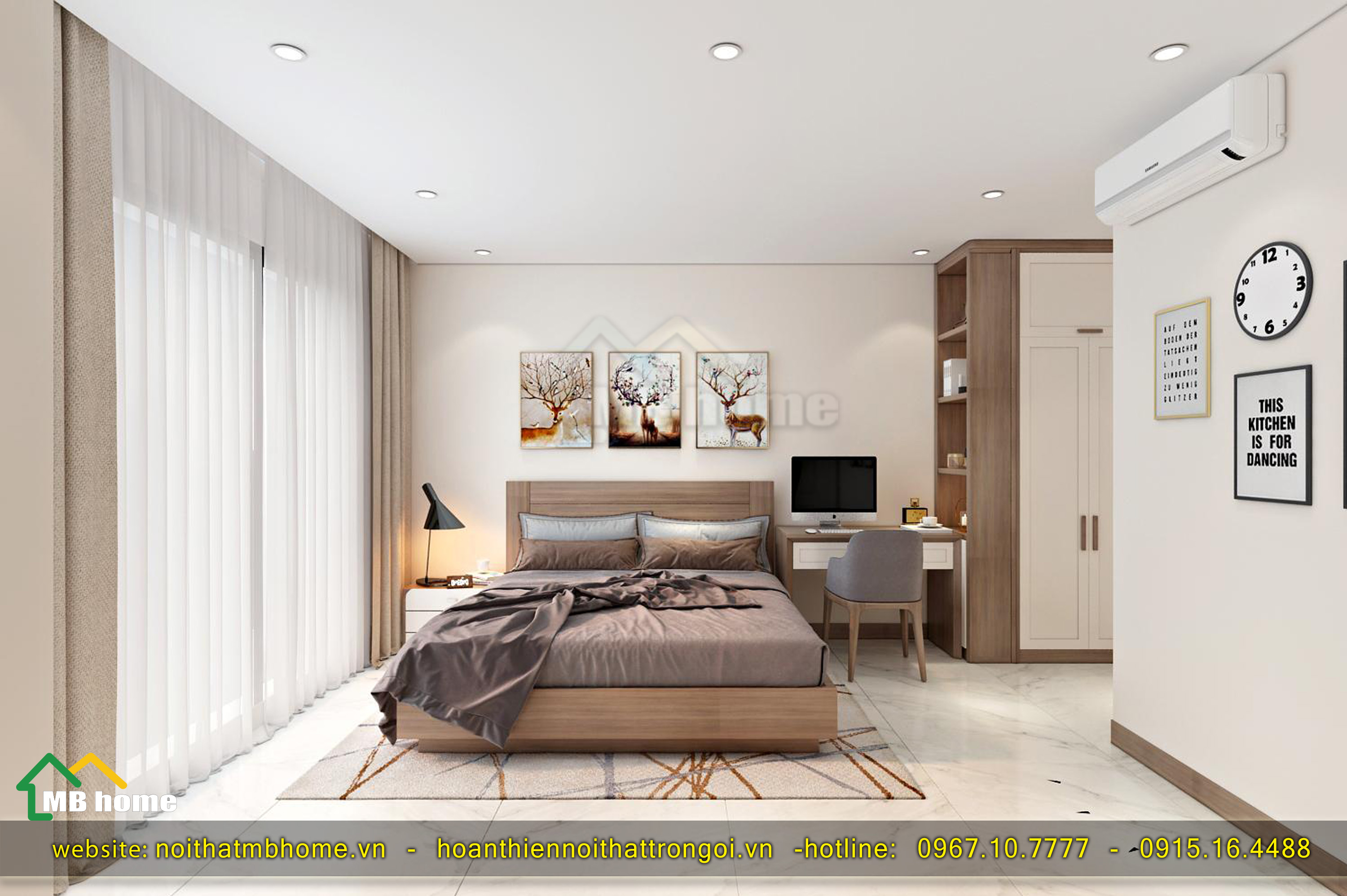 Bên cạnh đó, các kiến trúc sư MB Home còn khéo léo tận dụng những nội thất tủ treo tường, vừa là một nội thất trang trí đẹp mắt, lại giúp gia chủ có thêm 1 nơi để bày trí đồ đạc, sách vở gọn gàng.