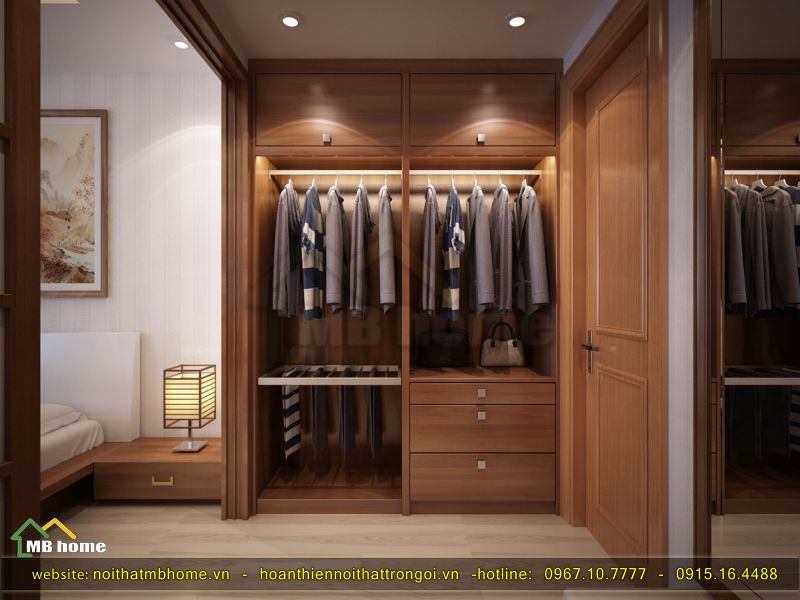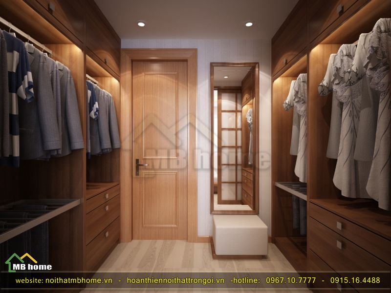 Không gian diện tích của phòng thay đồ tuy nhỏ nhưng có thể chứa được vô vàn bộ đồ với bộ tủ gỗ nâu độc đáo và ấn tượng.