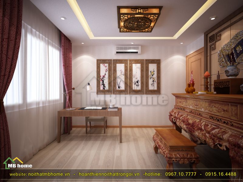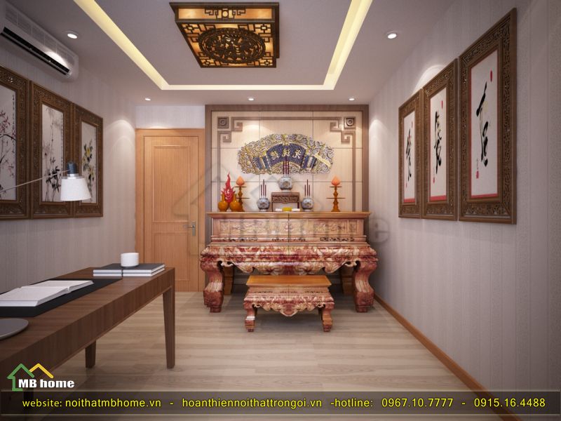 Phòng thờ là căn phòng cần sự yên tĩnh, tôn nghiêm nhất chính vì vậy phòng thờ được kiến trúc sư bố trí nào tại vị trí thuận lợi, phong thủy và phải tĩnh lặng nhất có thể. Các đồ nội thất từ bàn thờ, bàn ghế, cửa đển khung tranh đều được lựa chọn sát sao để phù hợp và mang nét đep nhất có thế.