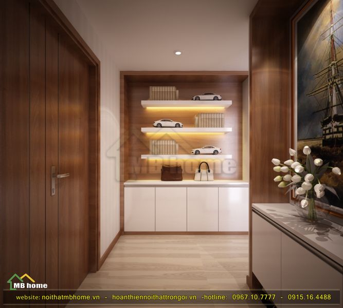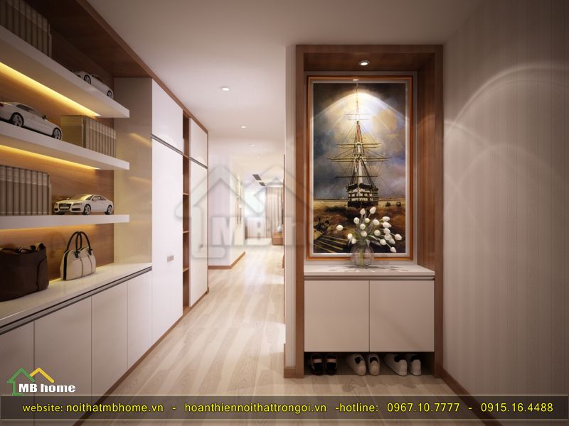 Lối đi vào từ cửa có diện tích nhỏ nhưng được thiết kế nội thất sắp xếp các tủ để đồ hay trang trí một chút nhờ kệ để đồ với bức tranh ảnh giúp cho chúng ta cảm thấy tự tỉ mỉ, cẩn thận qua từng chi tiết của căn phòng. Đi sâu thẳng vào sẽ đến căn phòng khách..