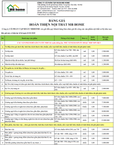 BẢNG BÁO GIÁ HOÀN THIỆN NỘI THẤT MB HOME - 2016 Công ty nội thất MBhome xin gửi tới quý khách hàng bảng báo giá hoàn thiện nội thất năm 2016 như sau: . Các bạn có thể tham khảo thêm các mẫu báo giá khác của nội thất MBhome tại đây: BẢNG BÁO GIÁ HOÀN THIỆN NỘI THẤT MB HOME - 2016 BẢNG BÁO GIÁ CẢI TẠO XÂY DỰNG MB HOME - 2016 BẢNG BÁO GIÁ SẢN XUẤT ĐỒ GỖ NỘI THẤT MB HOME - 2016 BẢNG BÁO GIÁ THIẾT KẾ NỘI THẤT - THIẾT KẾ KIẾN TRÚC GHI CHÚ : - Báo giá trên đã bao gồm công vận chuyển, lắp đặt trên địa bàn nội thành Hà Nội –...