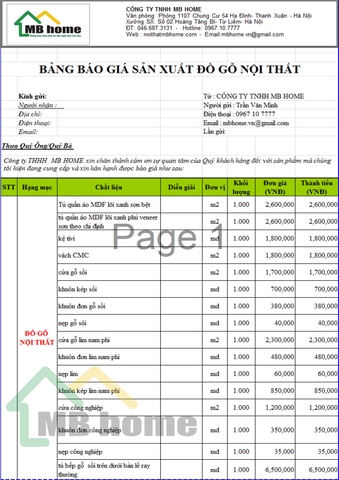 BẢNG BÁO GIÁ SẢN XUẤT ĐỒ GỖ NỘI THẤT MB HOME - 2016 Công ty nội thất MBhome xin gửi tới quý khách hàng bảng báo giá sản xuất đồ gỗ năm 2016 như sau: Các bạn có thể tham khảo thêm các mẫu báo giá khác của nội thất MBhome tại đây: BẢNG BÁO GIÁ SẢN XUẤT ĐỒ GỖ NỘI THẤT MB HOME - 2016 BẢNG BÁO GIÁ THIẾT KẾ NỘI THẤT - THIẾT KẾ KIẾN TRÚC BẢNG BÁO GIÁ HOÀN THIỆN NỘI THẤT MB HOME - 2016 BẢNG BÁO GIÁ CẢI TẠO XÂY DỰNG MB HOME - 2016 GHI CHÚ : - Báo giá trên đã bao gồm công vận chuyển, lắp đặt trên địa bàn nội thành Hà Nội –...