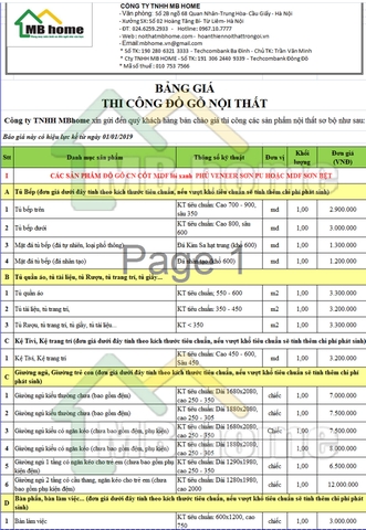Báo giá thi công đồ gỗ nội thất 2019 Công ty nội thất MBHome xin gửi tới quý khách hàng Báo giá thi công đồ gỗ nội thất 2019 của chúng tôi. Kính chúc Quý khách hàng có 1 năm 2019 đầy YÊN VUI - BÌNH AN - HẠNH PHÚC! GHI CHÚ : - Báo giá trên đã bao gồm công vận chuyển, lắp đặt trên địa bàn nội thành Hà Nội – Báo giá trên chưa bao gồm thuế VAT – Báo giá trên có thể thay đổi khi có thiết kế cụ thể – Đối với các mặt hàng đặc biệt sẽ có báo giá...