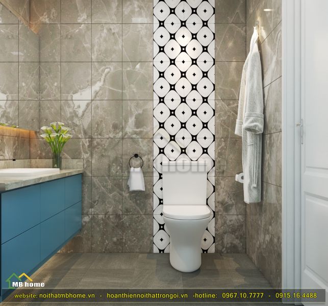 Có hai phòng vệ sinh kích thước khác nhau nên để tạo được sự trẻ trung kết hợp với sang trọng chúng tôi đã đưa ra hai phòng có màu vàng và xanh dương vô cùng độc đáo.