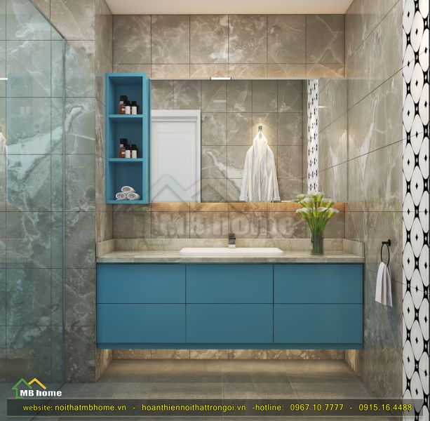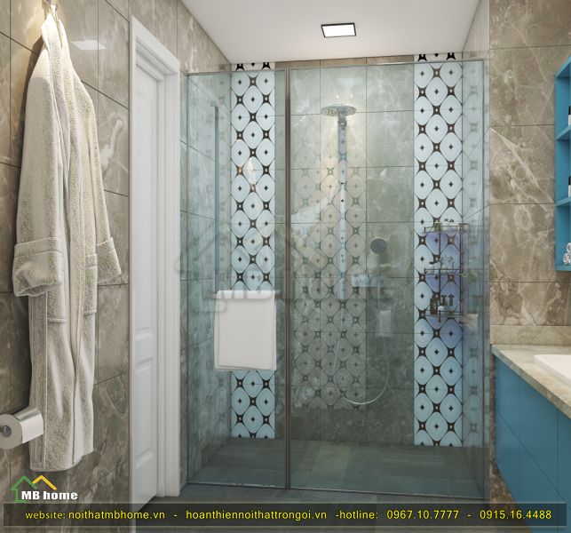 Phòng có màu xanh dương từ tủ để đồ đến lớp kính phòng tắm màu xanh nhạt tạo sự liên kết liền mạch. Với lớp tường lát gạch đá trắng nâu tạo sự trang trọng và tinh tế vô cùng.