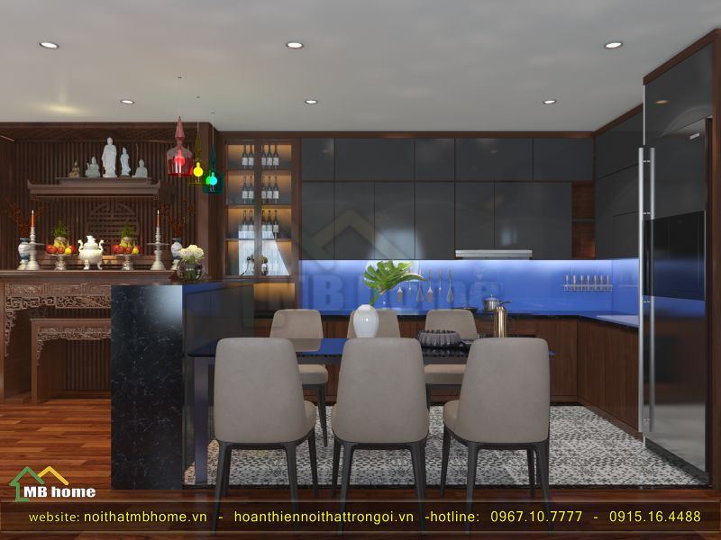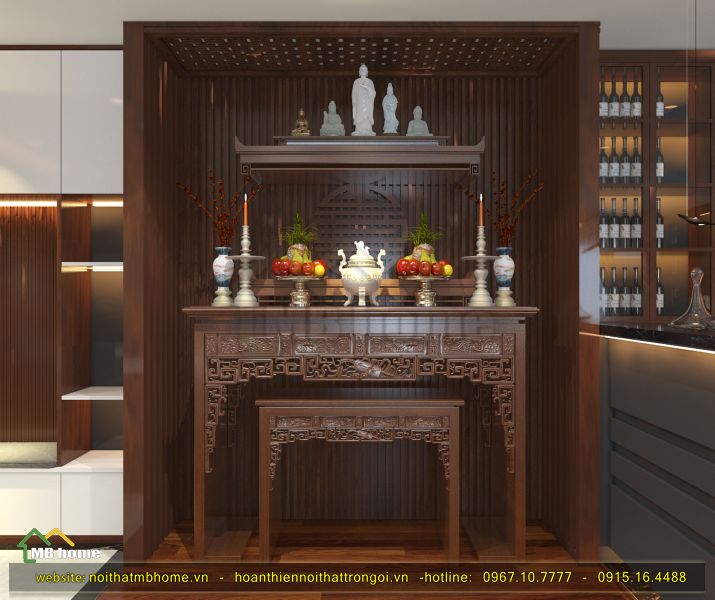 Được sắp xếp gọn gàng và phù hợp với phong thủy căn nhà nên được bố trí cạnh gian bếp. Phần nào hợp địa và còn thuận tiện giúp gia chủ dễ dàng đi lại lễ cúng và làm đồ,..