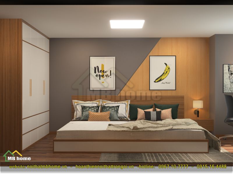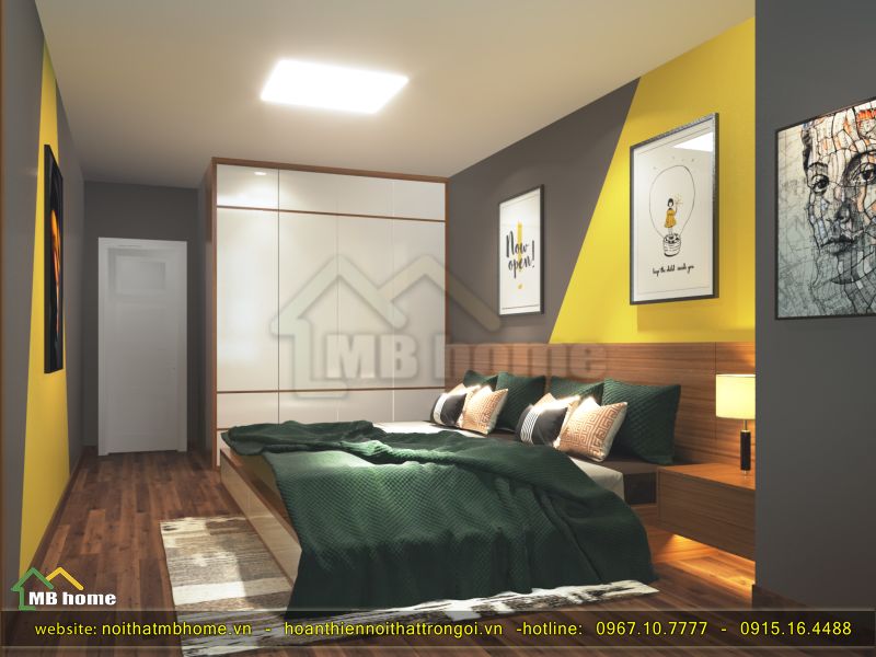 Với phong cách trẻ trung, nên căn phòng được tạo điểm nhấn tại lớp sơn chưa cách phân biệt hai màu tạo nên một điểm nhấn cá tính riêng biệt. Với chiếc giường size king.