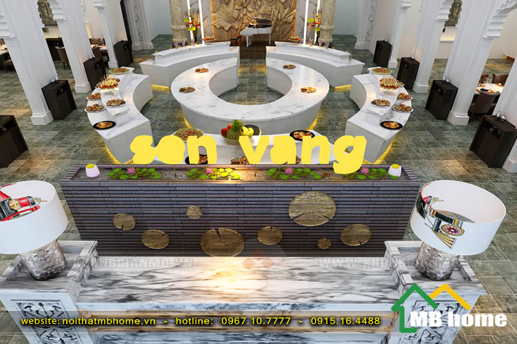 Với không gian sang trọng, khác lạ với gam mầu trắng của sơn tường kết hợp với các mảng họa tiết trang trí mầu vàng kim của gỗ tự nhiên cao cấp đã đem tới sự nhẹ nhàng, sạch sẽ và thanh thoát cho không gian chung của nhà hàng. Các khu vực ăn buffet và gọi món được thiết kế nội thất với phong cách mở, thoáng đãng, sang trọng và thuận tiện cho việc gọi món của khách và phục vụ của nhân viên nhà hàng.