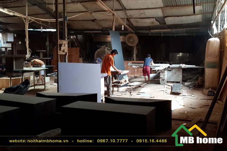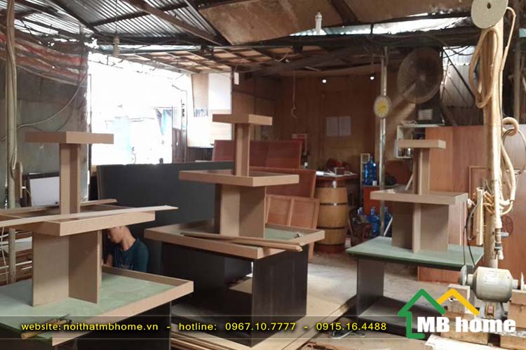 Các công nhân của nội thất MBhome đang thi công và sản xuất nội thất đồ gỗ siêu thị Thanh Hóa.