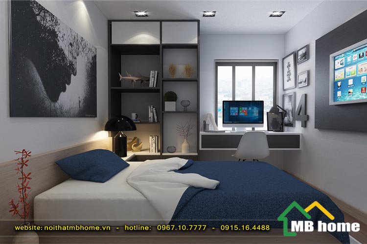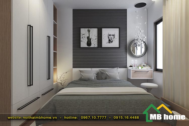 Nội thất phòng ngủ được thiết kế nội thất và thi công cẩn thận, chuẩn kích thước đến từng mm giúp cho căn phòng ngủ chung cư được gọn gàng, ngăn nắp, tuy nhỏ hẹp nhưng vẫn đầy đủ đồ đạc tiện nghi và thông thoáng...