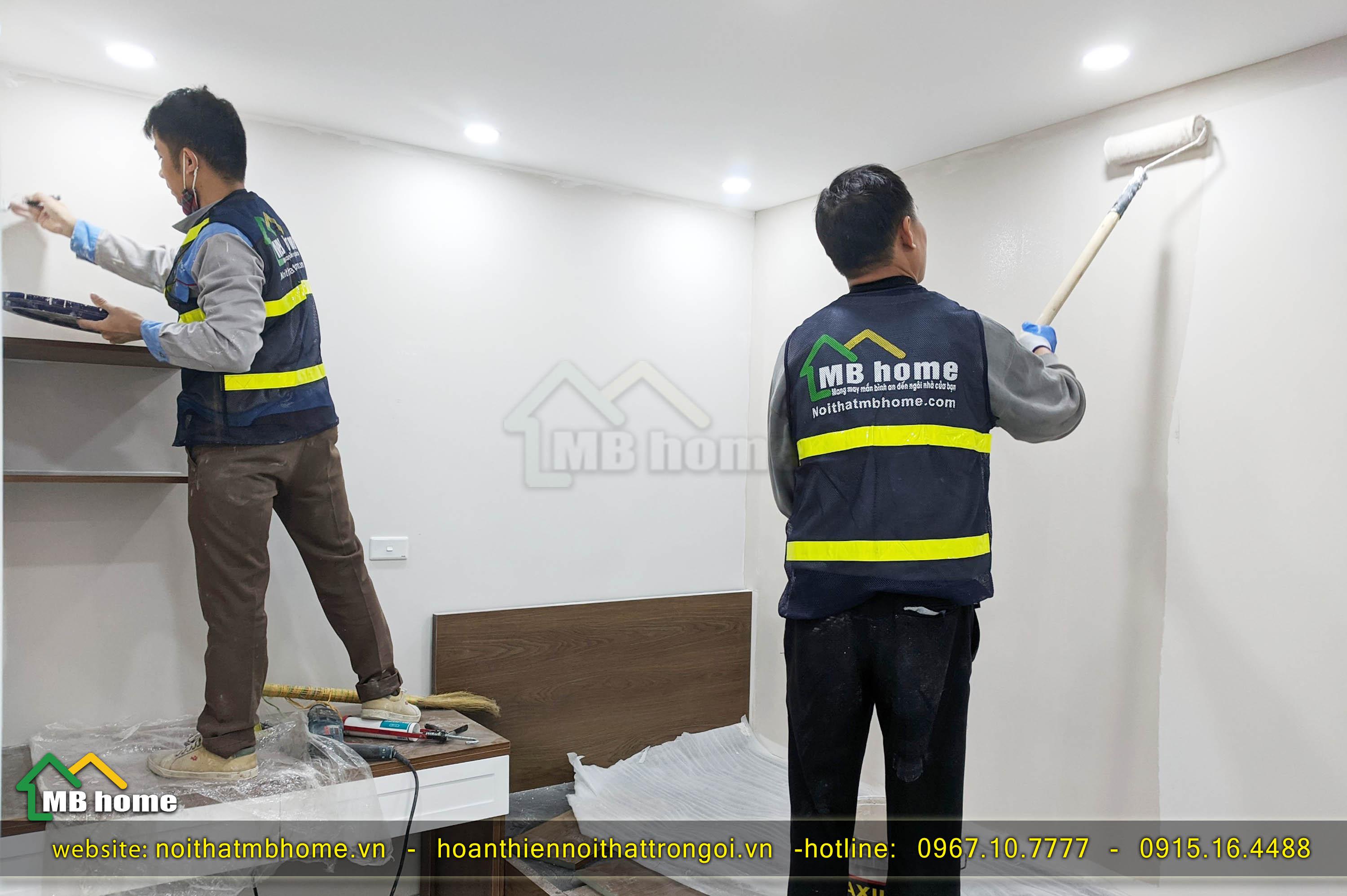 Toàn bộ tường nhà bên trong đều được sơn lót 3 lớp và hoàn thiện 2 lớp để đạt được màu đều cũng như chống thấm ổn định. Người thợ vô cùng tỉ mỉ chấm vá những vị trí khó hoặc không thể lăn được để bức tường không còn vết gợn hay thiếu sót điểm nào.
