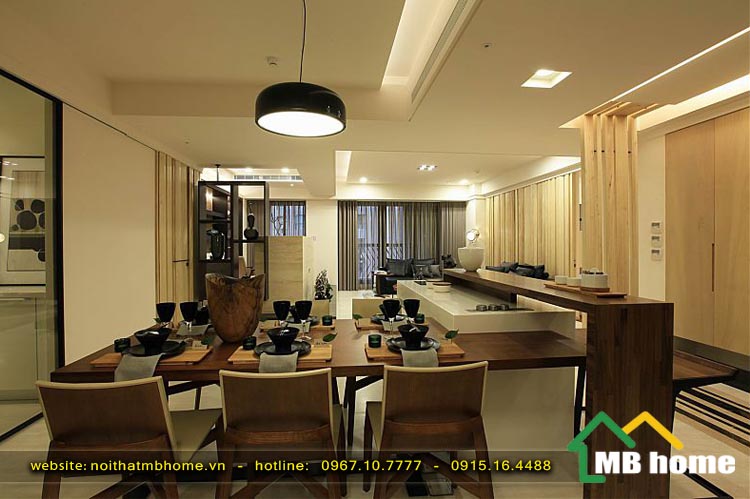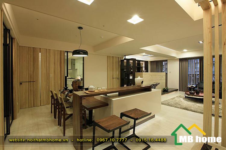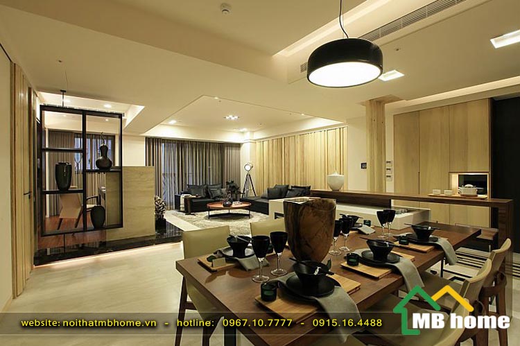 Nội thất phòng khách và bếp được nối liền nhau thành một không gian mở giúp cho căn phòng này trở nên thông thoáng và dễ chịu hơn. Đồ nội thất của căn phòng như sofa, bàn trà, tủ bếp, bàn ăn hay các bức vách ốp tường cùng hệ thống giá kệ được thi công tinh xảo, chuyên nghiệp bằng chất liệu gỗ tự nhiên cao cấp giúp cho nội thất của căn phòng khách trở nên sang trọng và đặc biệt hơn rất nhiều.