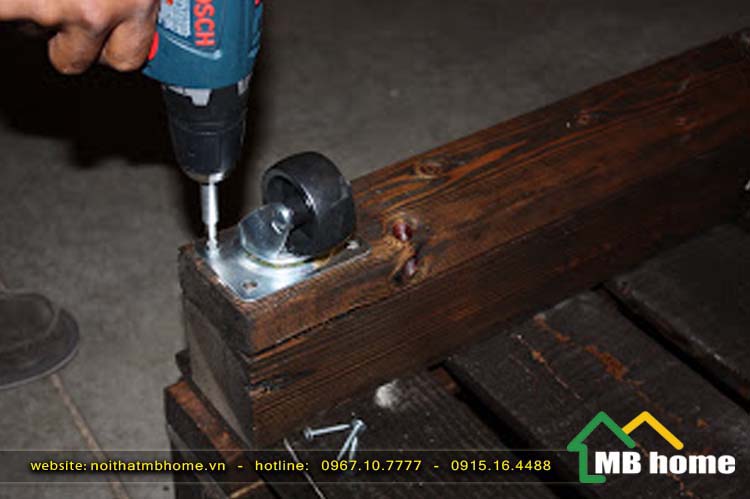 Khi sơn đã khô chúng ta tiếp tục công đoạn gắn bánh xe vào chân bàn trong trường hợp bàn muốn chiếc bàn trà bằng gỗ ghép thanh của mình di chuyển được, còn nếu không thích bạn có thể bỏ qua bước này.