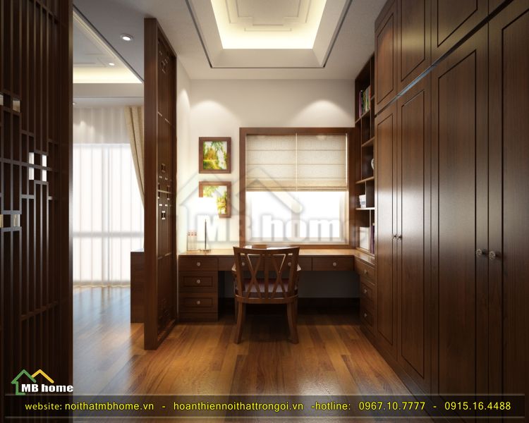 Sự ngăn cách không gian này cũng là một ý tưởng vô cùng sáng tạo bởi sự tiện lợi và sự riêng tư của gia chủ. Chiếc tủ gỗ quần áo được thiết kế nối liền chung với bộ bàn làm việc giúp cho khu vực này tăng thêm được sự liền mạch mà vẫn giữ được nét đẹp tinh tế.