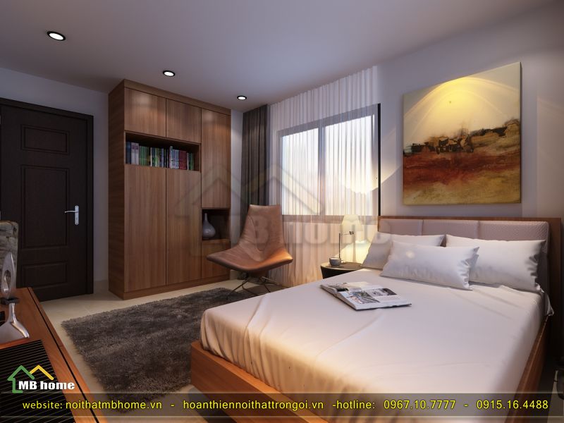 Lên đến căn phòng ngủ này, chị Minh Tuyết muốn nơi đây cần phải có sự ấm cúng và dễ chịu nhất nên chúng tôi đã sử dụng tone màu nâu gỗ nhiều hơn để có thể đáp ứng đươc nhu cầu của chị.