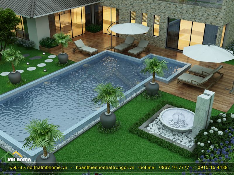 Bản thiết kế được sử dụng tối đa diện tích để làm các vị trí vui chơi thoải mái, như bể bơi, sân cỏ nô đùa, khu nướng BBQ ngoài trời,.. Ngoài ra để căn nhà có được cảm giác gần gũi với thiên nhiên nên đội ngũ thiết kế MB Home chúng tôi đã sử dụng nhiều đến lớp cỏ xanh mướt quanh nhà vô cùng đẹp mắt mà dễ chịu.