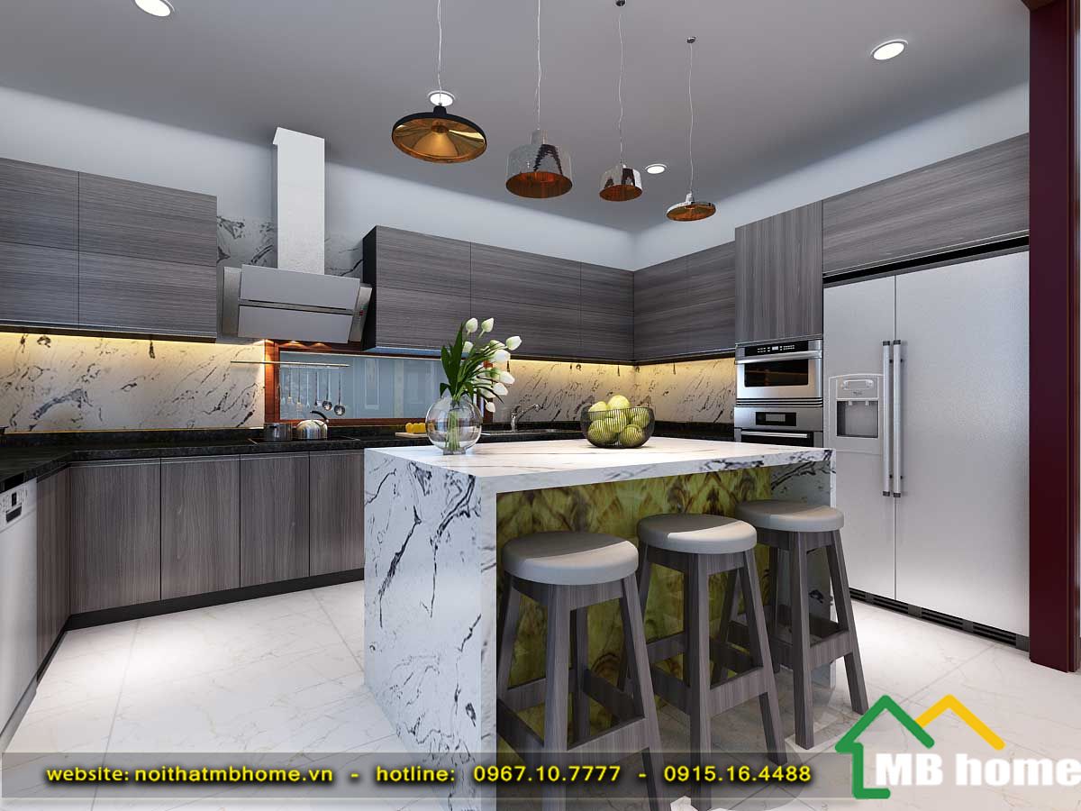 Nhà bếp được thiết kế với bàn đá, cộng với đồ gỗ và nội thất cao cấp mang màu sắc tưới sáng tạo cảm giác mát mẻ cho căn bếp