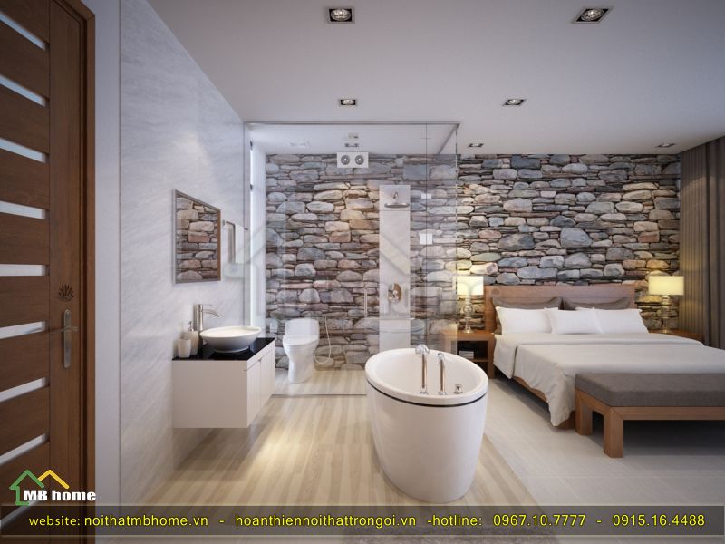 Tại căn phòng thứ 2 này chúng tôi hướng đến thiên nhiên gần hơn khi sử dụng bức tường gắn đá sỏi vô cùng lạ mắt mà còn cảm giác thoải mái, dễ chịu. Đặc biệt ở đây sử dụng phòng vệ sinh với lớp kính trong suốt ngay trong phòng ngủ này. Ý tưởng rất táo bạo mà còn ấn tượng.