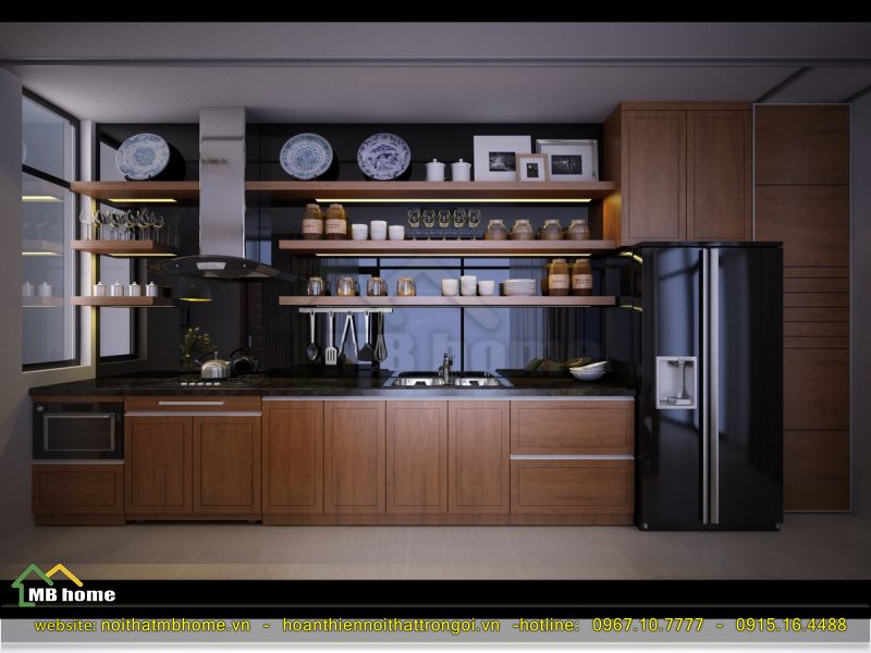 Để không gian bếp trở nên sang trọng thì chúng tôi đã lựa chọn mẫu bộ tủ bếp màu nâu gỗ cùng lớp kính màu đen vô cùng ấn tượng và khác biệt. Sử dụng loại tủ cao sát trần cũng với có sẵn các hốc để để vừa các mẫu máy móc thiết bị như tủ lạnh, lò nướng,..