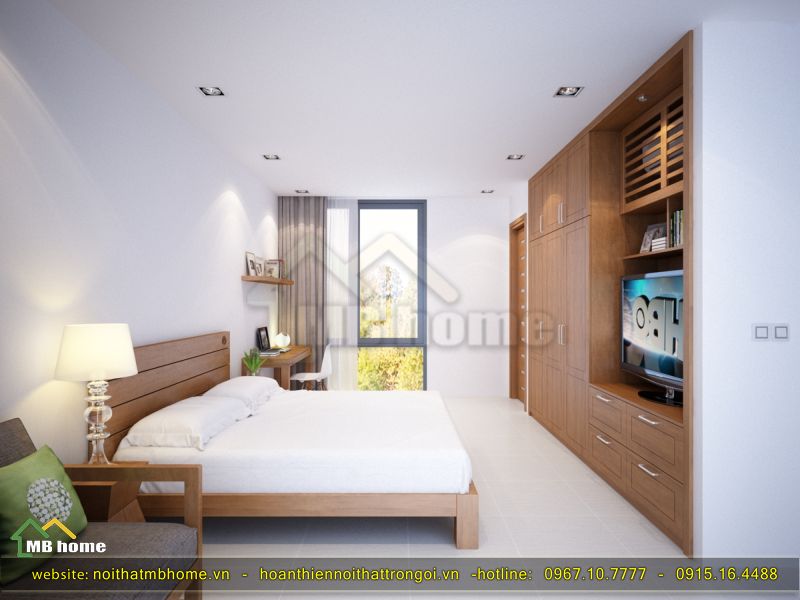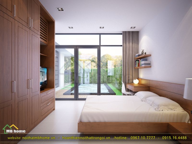 Căn phòng này mang một nét trong sáng, thu hút nhờ sự nhẹ nhàng qua màu trắng và nâu sáng khiến cho phòng thêm đẹp và sang trọng hơn. Ngoài ra còn bao gồm cả phòng vệ sinh ngay trong phòng, các kiến trúc sư MBHome cũng đã khéo léo thiết kế khung cửa kính lớn hướng ra phía ao cá nhỏ phía sau.