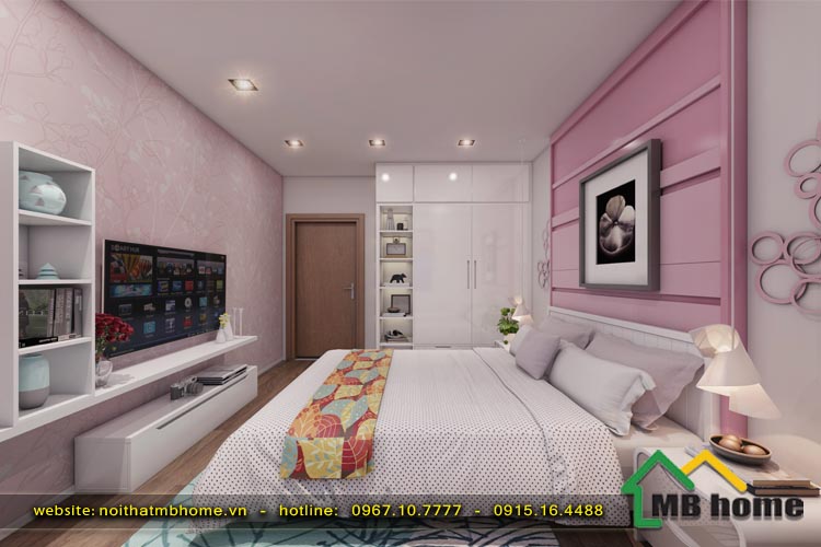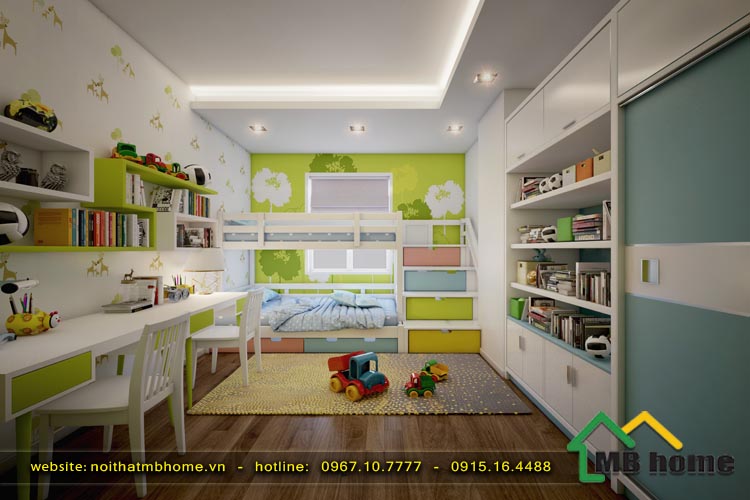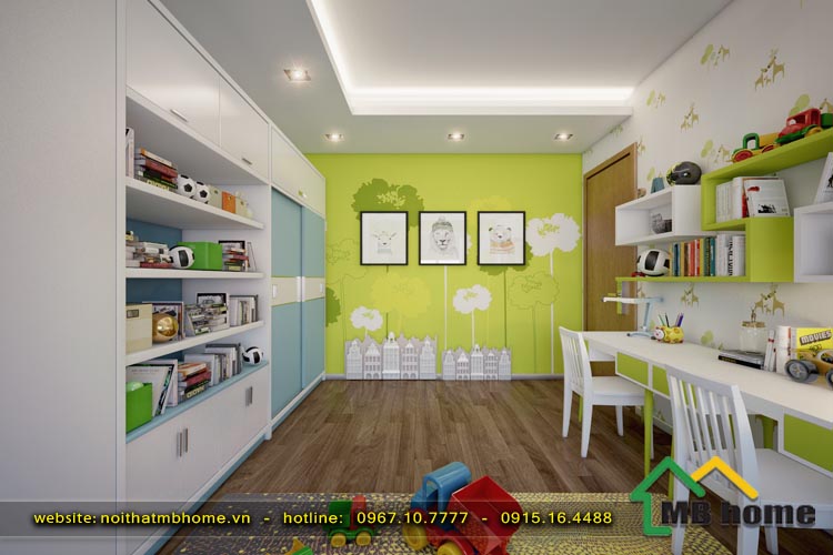 Với phòng ngủ của các bé do sở thích và độ tuổi khác nhau nên nội thất MBhome đã bố trí mặt bằng và thiết kế nội thất thành 2 căn phòng khách nhau phù hợp với sở thích và giới tính của các bé. Phòng ngủ bé gái được thiết kế nhẹ nhàng với gam mầu hồng - trắng rất ngọt ngào đáng yêu. Còn phòng ngủ bé trai là mầu xanh - trắng trẻ trung năng động, giúp cho các bé có thể thoải mái vui chơi, học tập và nghỉ ngơi trong chính không gian riêng tư của mình.