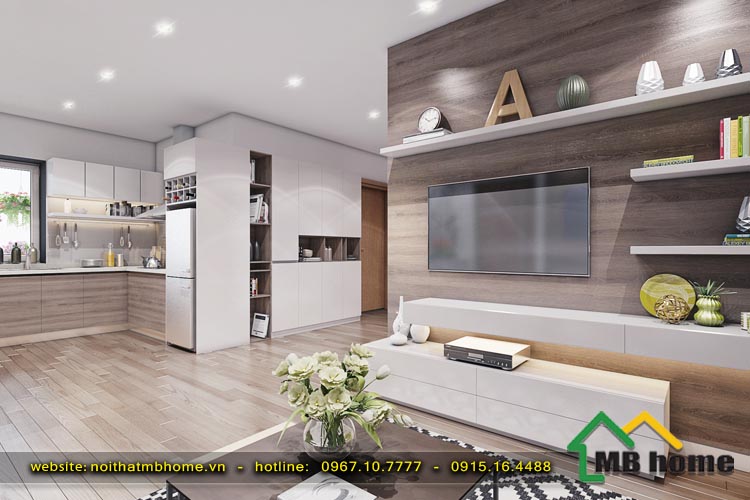 Nội thất phòng khách và bếp được thiết kế theo phong cách mở với gam mầu trắng sáng trẻ trung, hiện đại, giúp cho không gian của căn phòng khách được nới rộng ra rất nhiều.