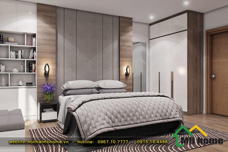 Nội thất phòng ngủ bố mẹ cũng được sử dụng gam mầu trắng và ghi nhạt cùng với tổng thể nội thất của phòng khách, giúp cho ngôi nhà có sự đồng đều và thống nhất trong việc sử dụng mầu sắc và thiết kế làm tăng thêm sự hiện đại cho căn phòng ngủ. Bên cạnh đó các chi tiết nội thất khác như giường tủ, hay kệ giá trang trí cũng được bố trí hài hòa, ngăn nắp phù hợp với diện tích của căn phòng, giúp cho căn phòng trở nên thông thoáng nhưng vẫn đầy đủ tiện nghi phục vụ cho nhu cầu của chủ nhân.