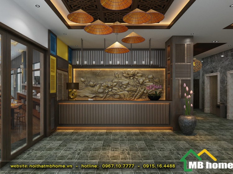 Quan trọng hơn hết trong khách sạn này chính là các nội thất trang trí, các kiến trúc sư của MB Home đã tận dụng tối đa các sản phẩm đặc trưng của văn hóa Việt Nam như đèn treo trần bằng nón lá, bình gốm, hoa sen hay bức tường điêu khắc chim cò, …