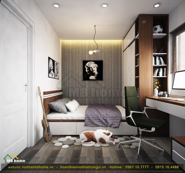 Với gam màu sáng kết hợp với nội thất gỗ, không gian như được nới rộng, thông thoáng. Tủ đồ với chiều cao chạm trần nhằm giảm tối đa không gian thừa đồng thời đồ dùng được đặc sát vách mở rộng không gian cho lối ra vào. Và không thể thiếu trong căn phòng đó là TV, kệ sách 2 trong 1 và tấm thảm lông cao cấp.