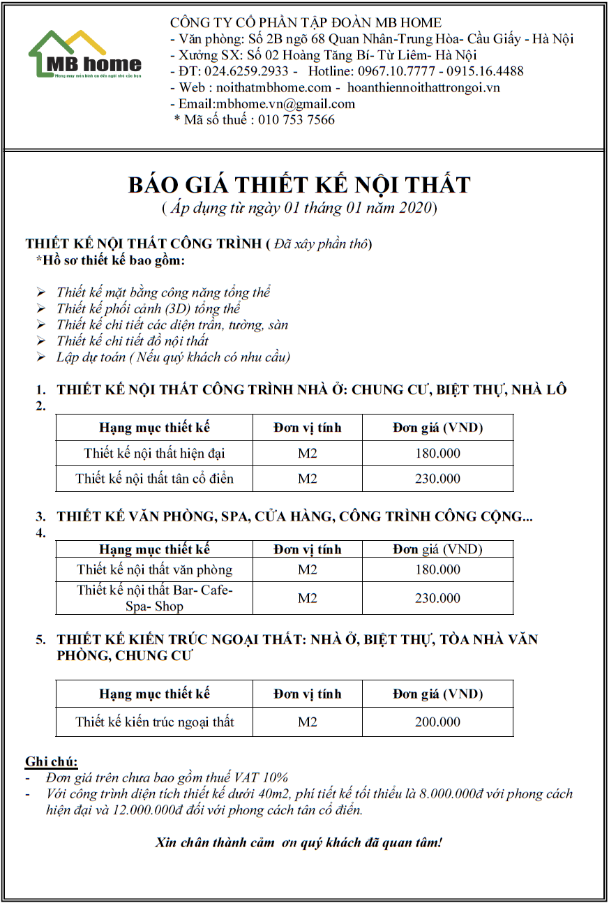 Cùng với MB Home tham khảo Bảng báo giá nội thất thiết kế chi tiết và cụ thể mới nhất của năm 2020. Trong bảng báo giá nội thất được ghi rất rõ từng bảng giá nội thất chung cư đến các công trình dự án khác nữa. Xin mời các bạn tham khảo!