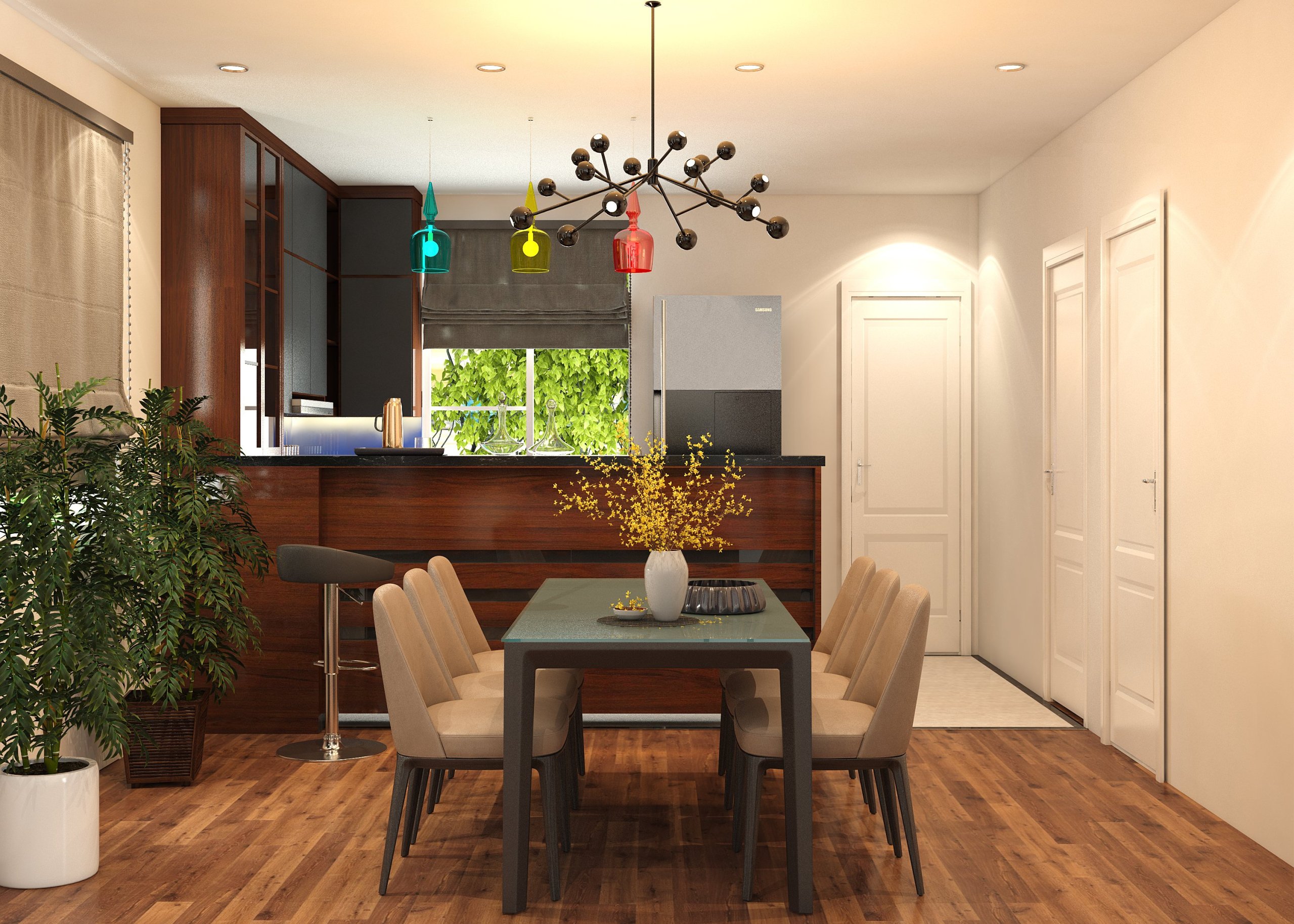 Ngay cạnh phòng khách là quầy bar nhỏ phục vụ đồ uống hay tiệc nhẹ, cùng với tiêu chí phong cách hiện đại sang trọng thì tại đây được sử dụng rất nhiều các tone màu nâu và ánh đèn vàng giúp gia chủ cảm thấy được sự tinh tế và ấm cúng. Che đi phần bếp phụ là một bàn bar đơn giản và nhỏ gọn tiện nghi.