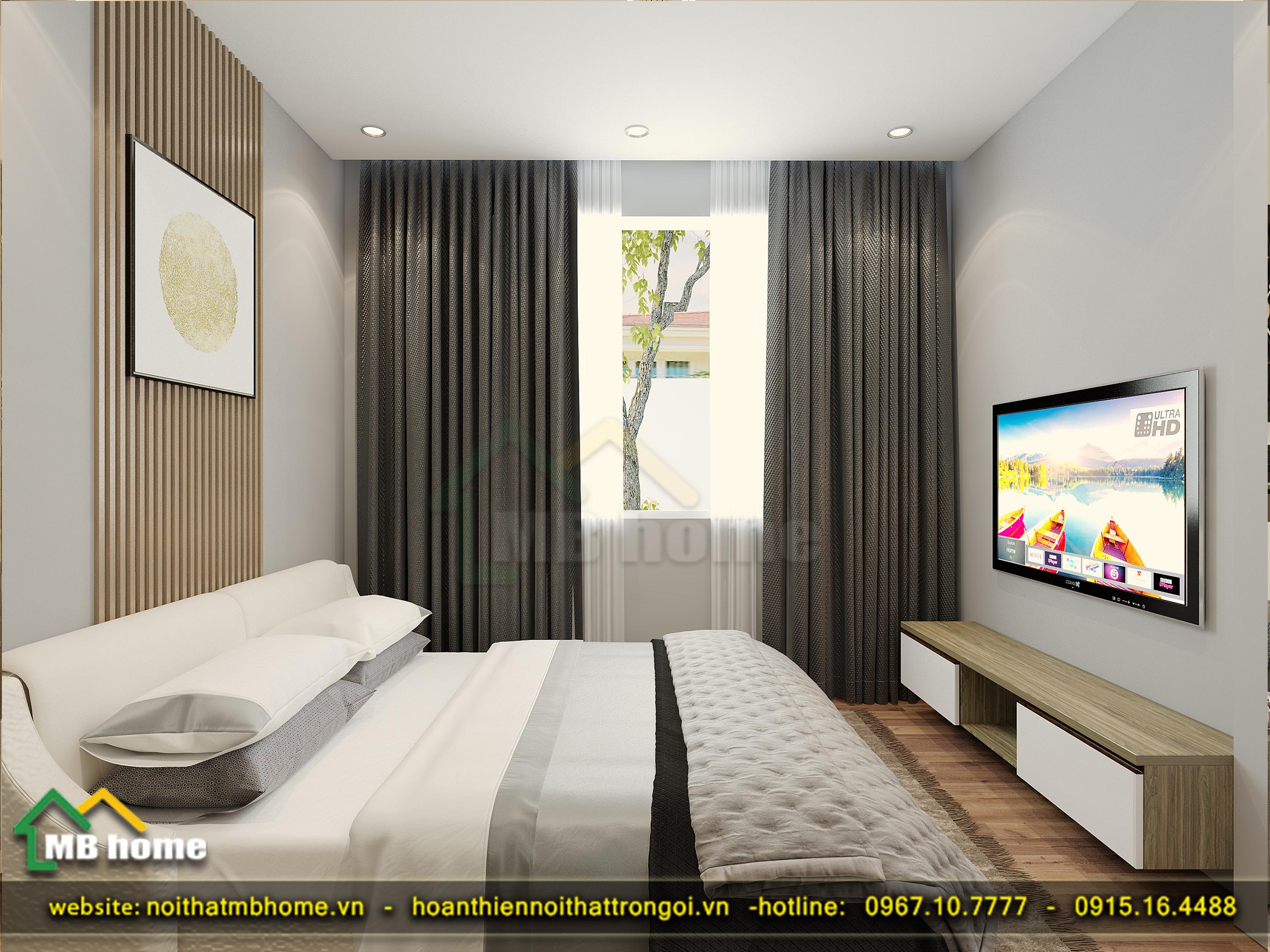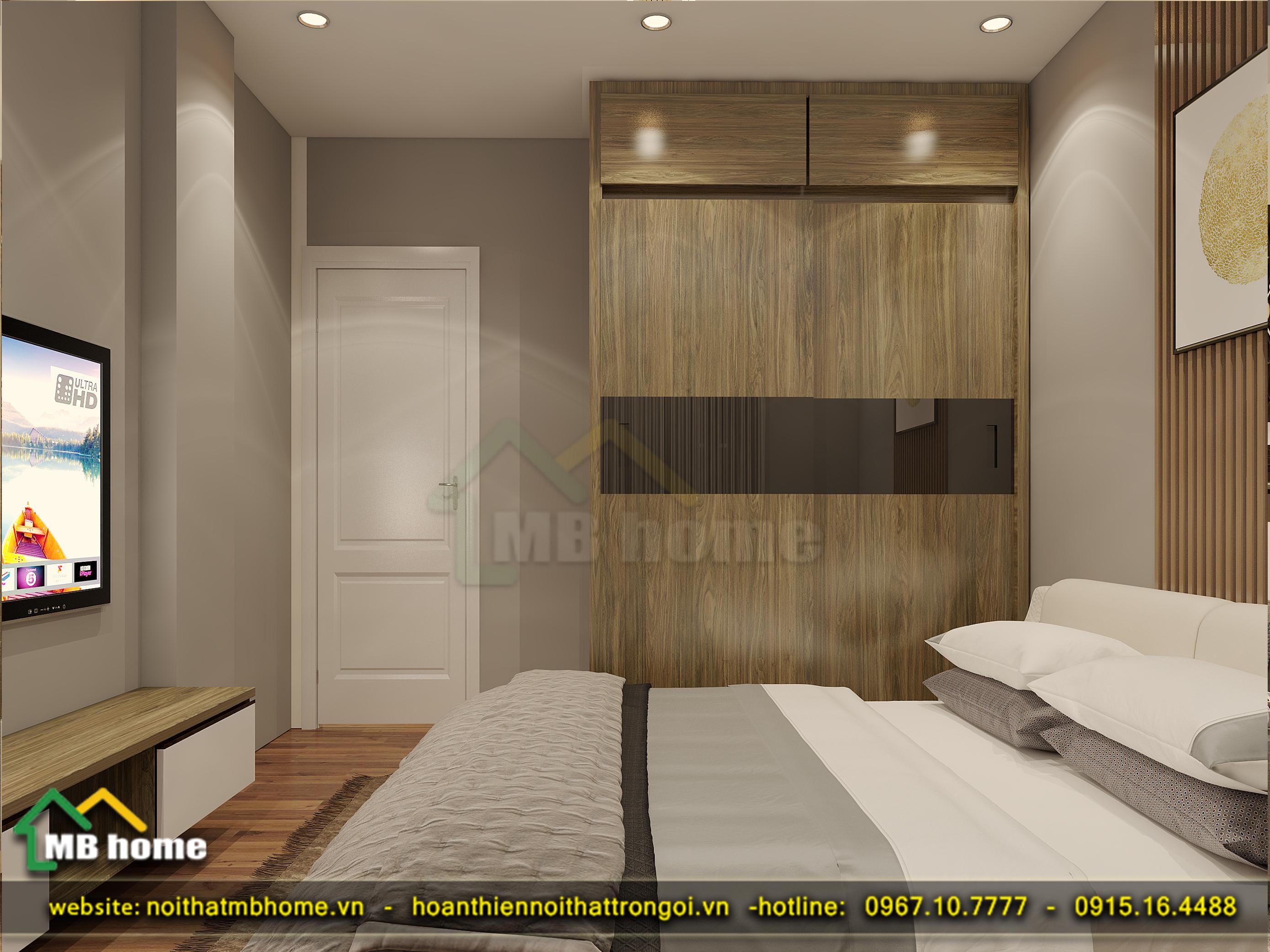 Tủ quần áo gỗ nâu được xếp ngăn ngắn cạnh cửa ra vào phòng, kệ tivi đặt vị trí đối diện với giường ngủ giúp phần nào tiết kiệm diện tích mà còn tạo nên sự thoải mái, dễ sử dụng.