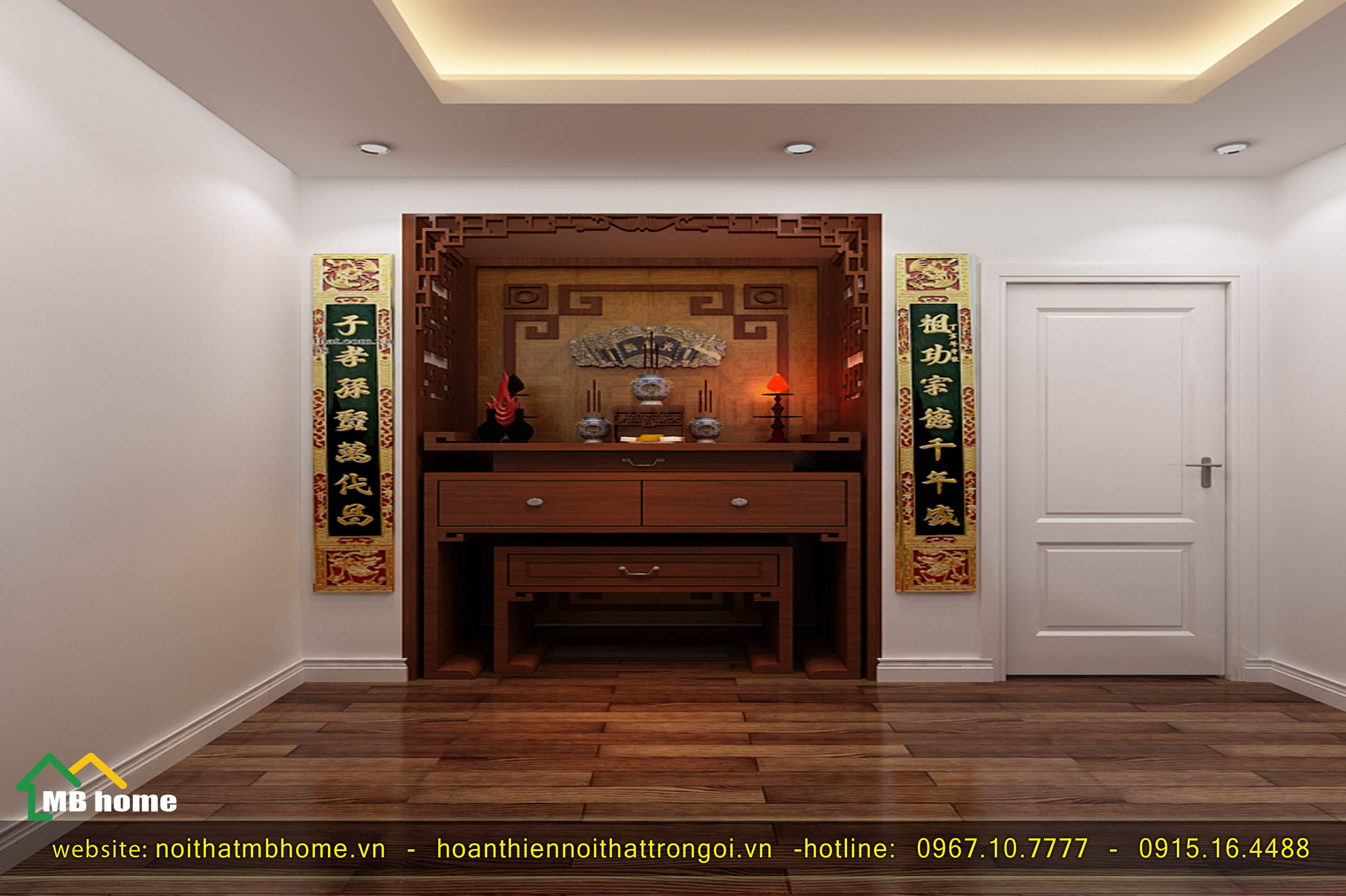 Mặc dù là một căn chung cư nhưng MB Home vẫn cố gắng sắp xếp cho gia đình một không gian bàn thờ riêng biệt, với phong cách cổ điển, khác hoàn toàn so với sự hiện đại tại phòng khách hay phòng ăn.