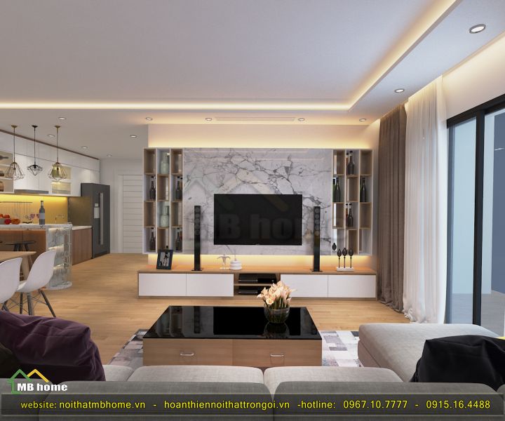 Tại bàn thiết kế nội thất tuyệt đẹp này, các kts cũng không quên bố trí các thiết bị công nghệ hiện đại như tivi, loa đài,..để có thể gắn kết cả gia đình quây quần bên nhau. Chiếc tivi được lắp đính trên bức tường đá họa tiết vân đá trắng xám vô cùng sang trọng và quý phải. Cùng với các kệ tủ đứng trang trí ở hai bên tạo nên sự tinh tế, tao nhã.