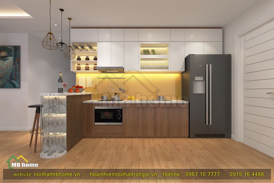 Không gian bếp thì đặc biệt nhỏ gọn, ngăn nắp với chiếc tủ lạnh âm tường giúp tiết kiệm được tối đa diện tích phòng. Tủ bếp có tone màu chủ đạo là màu trắng và nâu gỗ cùng với lớp kính màu vàng chanh tạo nên một cảm giác ấm cúng, hiện đại và tinh tế.