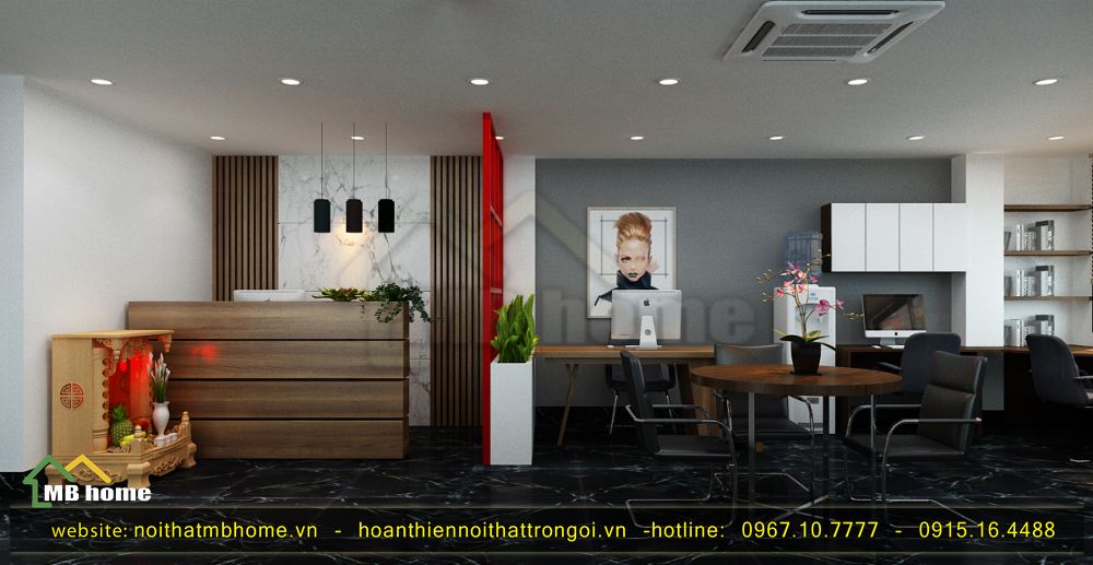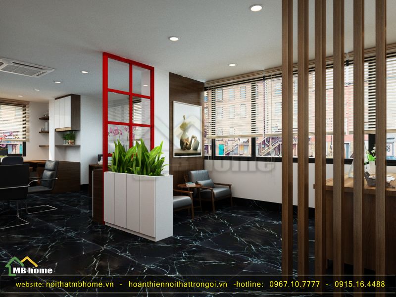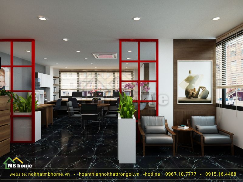 Tại đây có diện tích nhỏ do vậy mà Mẫu thiết kế nội thất văn phòng công ty đẹp nhất này cần đến sự sắp xếp tài tình của nhà thiết kế MB Home, từ phía bàn lễ tân đi vào được bố trí bộ ghế ngồi chờ của khách thể hiện được sự tận tình và chuyên nghiệp. Sử dụng kệ chậu cây đứng, ô cửa đỏ để ngăn cách giữa khu vực chờ và không gian làm việc. Và để các vị trí không bị trống nên các bức tranh được treo lên nhằm giảm bớt không gian thừa.