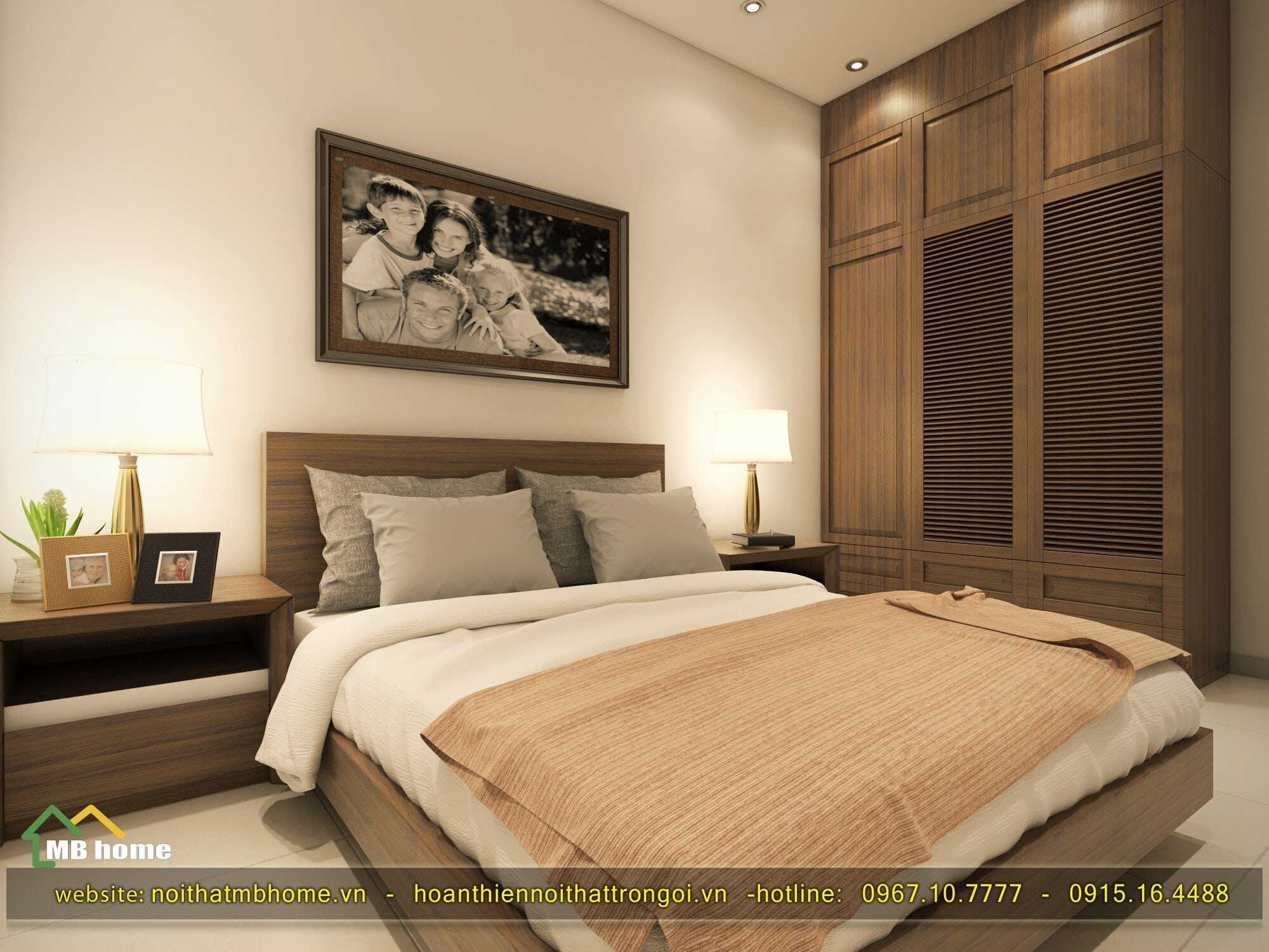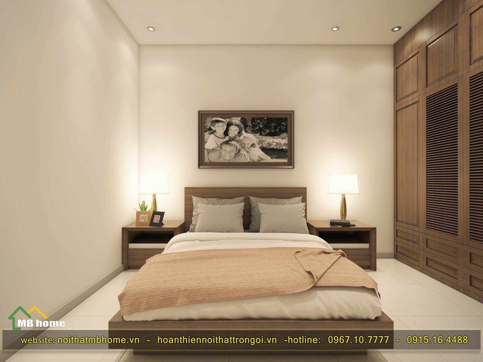 Đầu tiên là không gian riêng dành cho vợ chồng anh chị Khương. MB Home đưa vào đây thiết kế nội thất theo hơi hướng hiện đại nhưng tối giản với chất liệu gỗ tự nhiên.