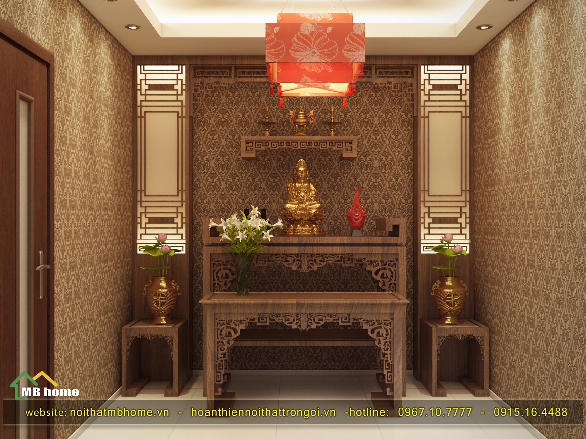 Tầng trên cùng với phòng thờ chính là nơi gia chủ tĩnh tâm và tưởng nhớ tổ tiên. Vì thế MB Home sử dụng tone màu trầm của gỗ làm chủ đạo, sử dụng giấy dán tưởng cao cấp với họa tiết tương đồng với họa tiết kệ thờ.