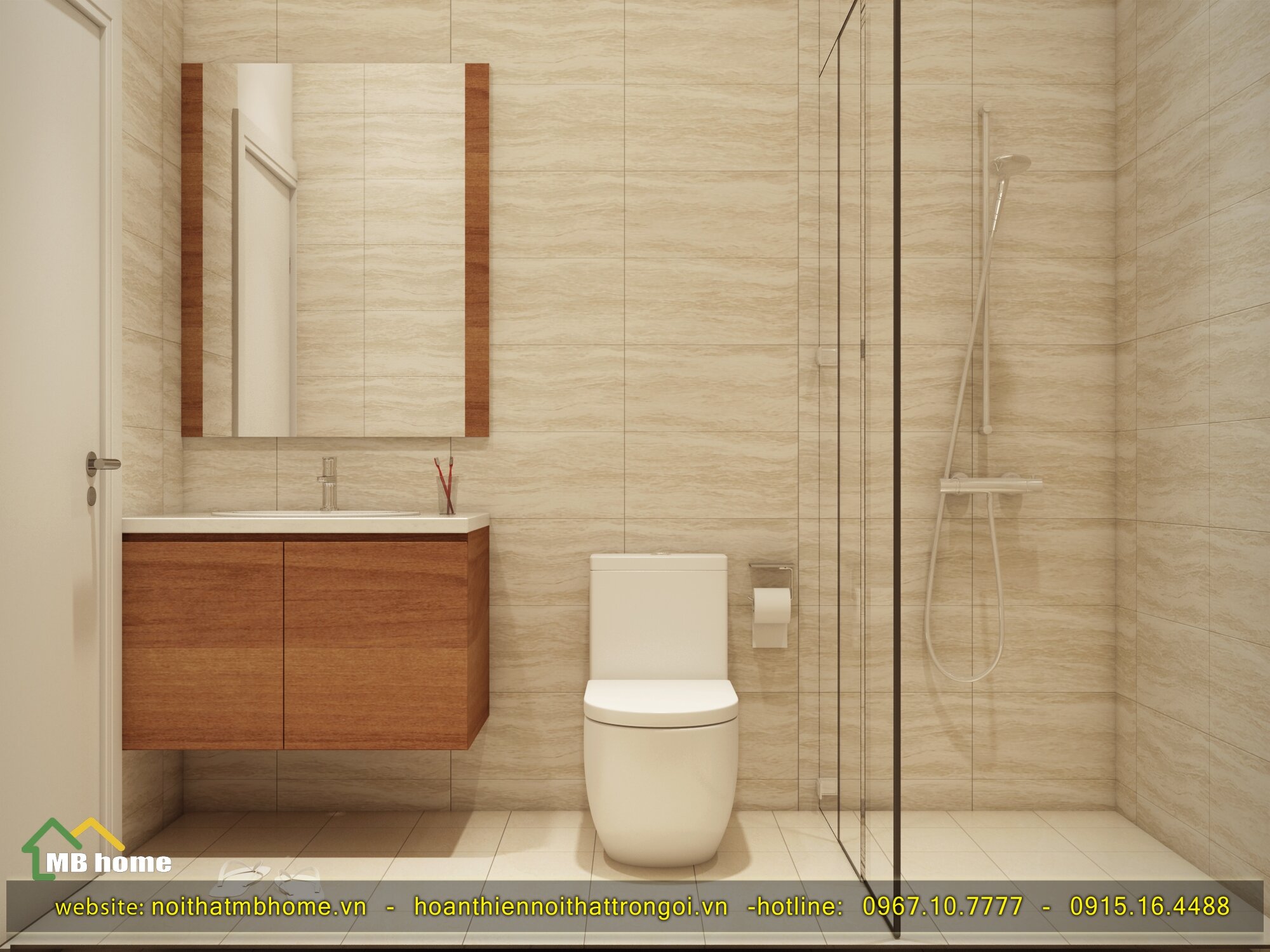 Với phong cách đơn giản, MB Home gợi ý anh Khương sử dụng buồng tắm đứng, cùng với đó là kệ rửa mặt và gương được nhấn nhá đường nét bằng màu gỗ sáng.