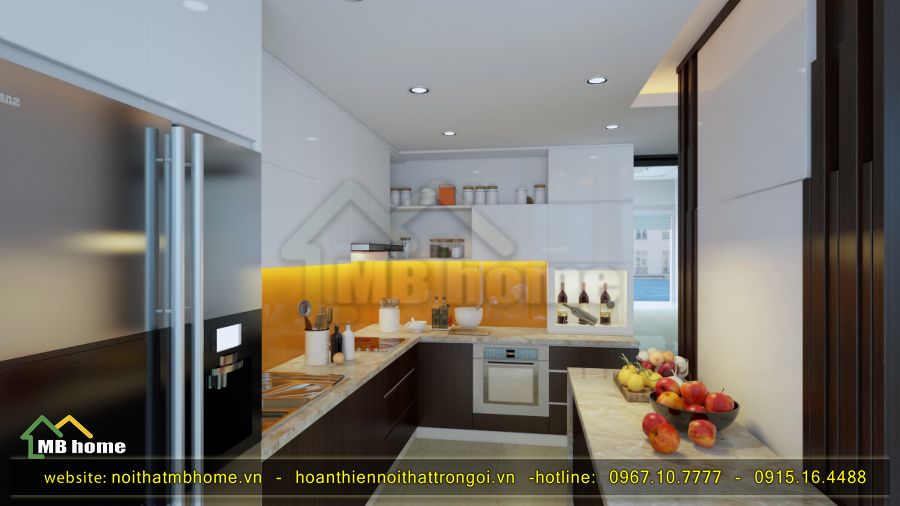 Tiếp đến là phòng bếp với sự kết hợp giữa tone màu trắng xám và nâu. MB Home sử dụng nội thất bếp hiện đại với đầy đủ tiện nghi được bố trí đặt cùng hướng với cửa ra vào. Đèn ốp trần được ưu tiên sử dụng tạo cho không gian thêm rộng.
