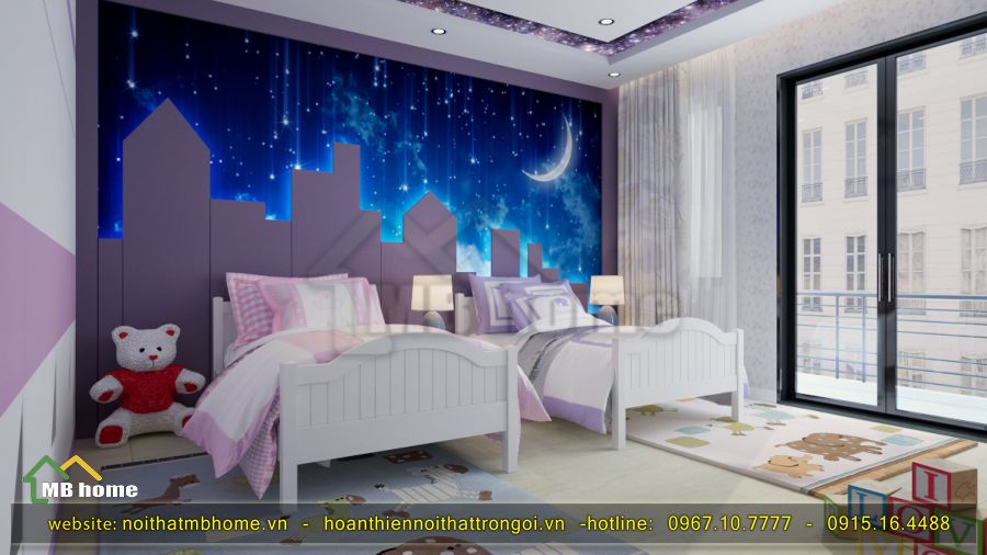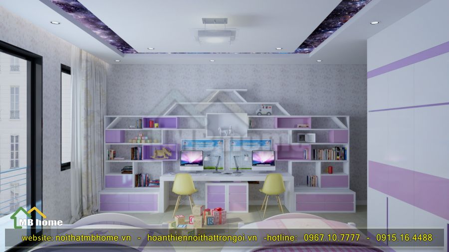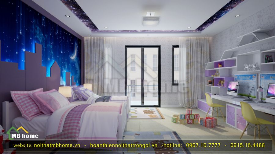Hai bé nhà anh chị Tâm đều là hai bé gái, thích màu tím và xanh vô cùng. Vì thế MB Home đã nhanh chóng nắm bắt tâm lý, sở thích của hai bé, thiết kế nội thất với tone màu tím đầy mộng mơ.