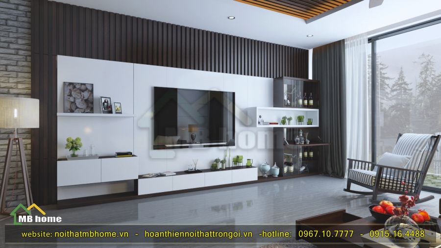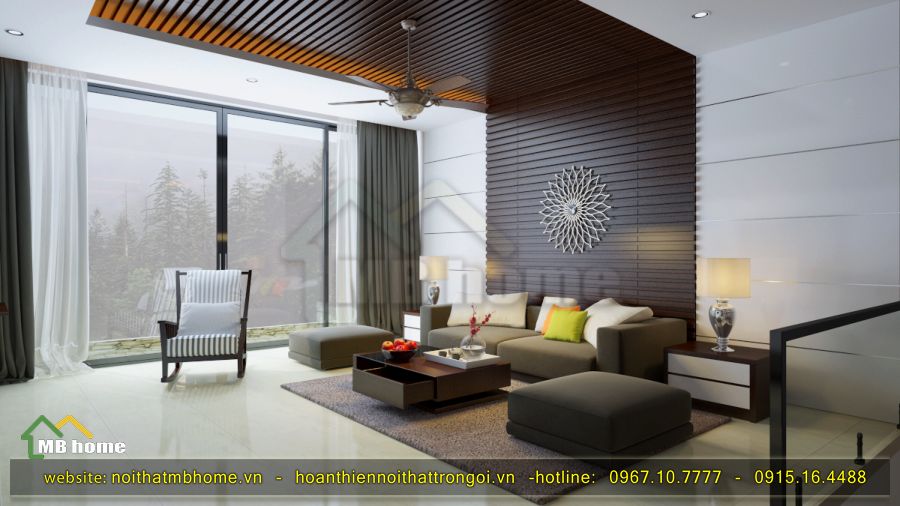 Tone màu chủ đạo được sử dụng là trắng đen cơ bản mà rất hiệu quả. MB Home sử dụng ghế sofa màu xám, không lưng với kiểu dáng hiện đại, sát với tường. Cùng với đó là thiết kế gỗ ốp tường trườm lên trên trần nhà đầy kiểu cách.