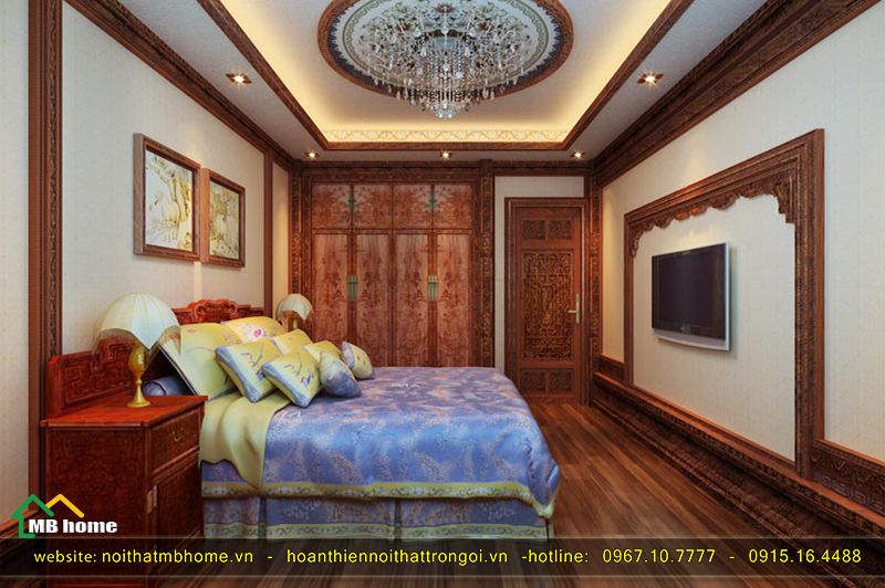 Khi nhắc đến những thiết kế hoa văn, chắc hẳn nhiều người sẽ nghĩ nó rất rối mắt và phức tạp hóa không gian. Nhưng thực chất, với việc sắp xếp khéo léo, không gian phòng ngủ mà MB Home lắp đặt rất vừa vặn, không có quá nhiều chi tiết thừa thãi, đem lại một không gian thoáng đãng và ấm cúng giúp giấc ngủ cũng trở nên sang trọng hơn. Đối với những ai mê màu sắc trầm lắng của gỗ, yêu những giá trị nghệ thuật trên những sản phẩm tranh vẽ và chăn thêu tay, căn phòng ngủ này chắc chắn sẽ khiến bạn say đắm.