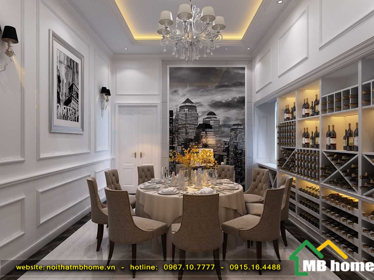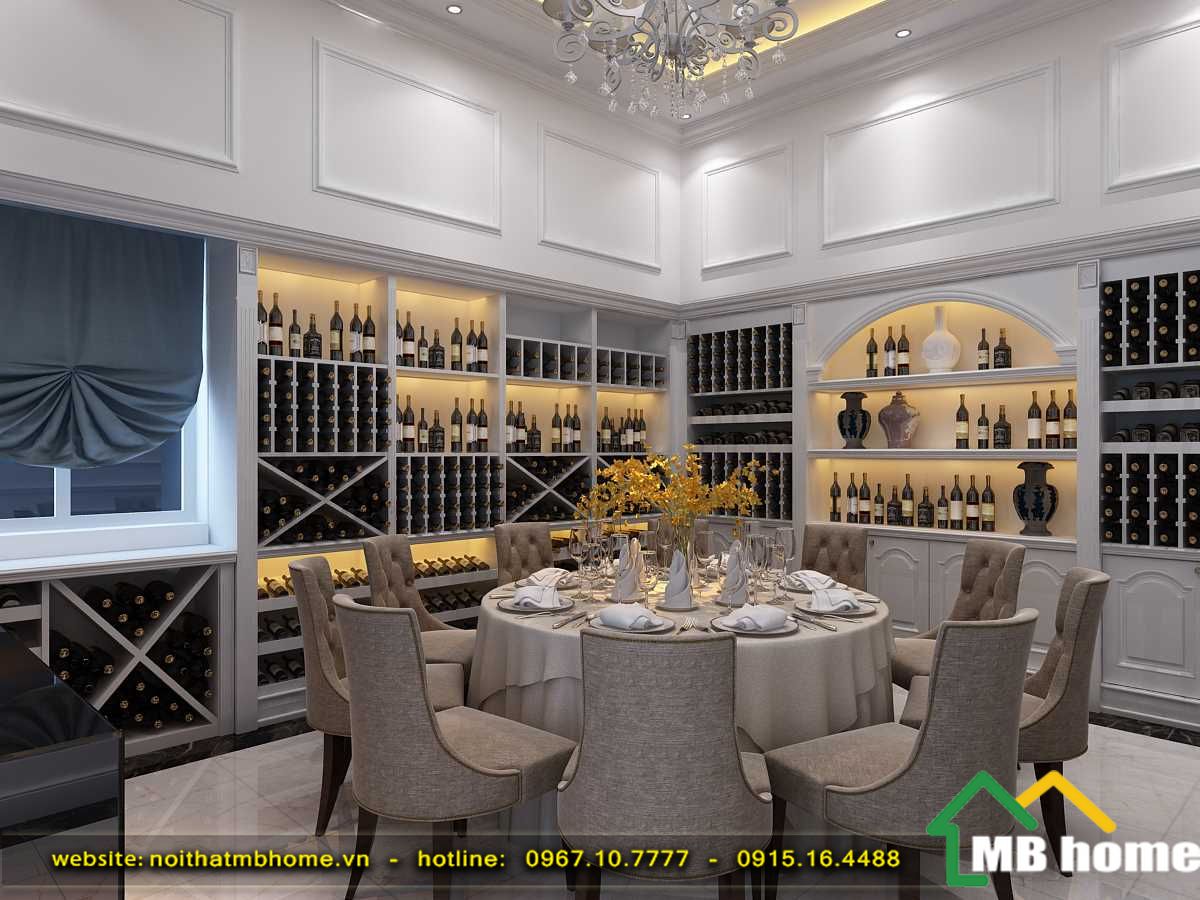 Thiết kế nội thất - bàn tiệc tròn kết hợp với phong cách trưng bày rượu vang mang đậm phong cách hiện đại - thưởng thức món ăn, nhâm nhi và ngắm nhìn những chai rượu vang bên gia đình và bạn bè thật thú vị phải không nào.