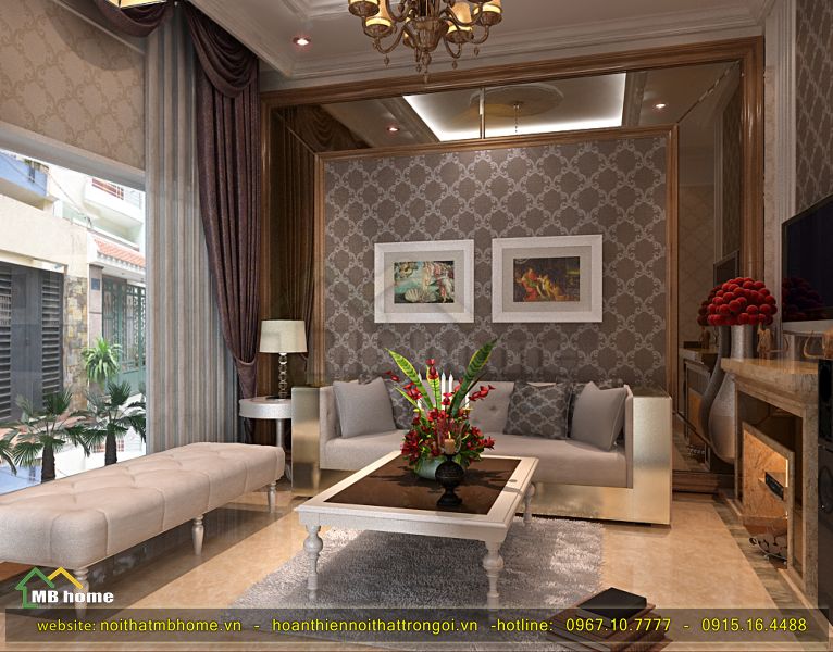 Căn phòng khách này gồm có đầy đủ các đồ dùng máy móc công nghệ hiện đại như tivi, điều hòa, loa đài,..thậm chí còn có cả lò sưởi mô hình ngay trong nhà giúp gia chủ có cảm giác ấm cúng hơn. Các bạn cũng có thể tham khảo thêm về dự án thiết kế khác của MB Home như Dự án thiết kế nhà lô phố ấn tượng hoặc Thiết kế kiến trúc nhà phố tại Hoài Đức